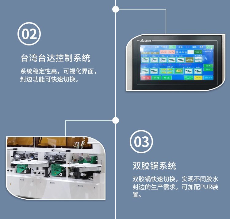 品脉数控PE-668JKS—ⅡS是一款上下胶锅预铣跟踪封边机,采用重型机架,高标准装配工艺及知名品牌配件,设备故障率低,封边效果好。可配套中高端板式家具生产解决方案。