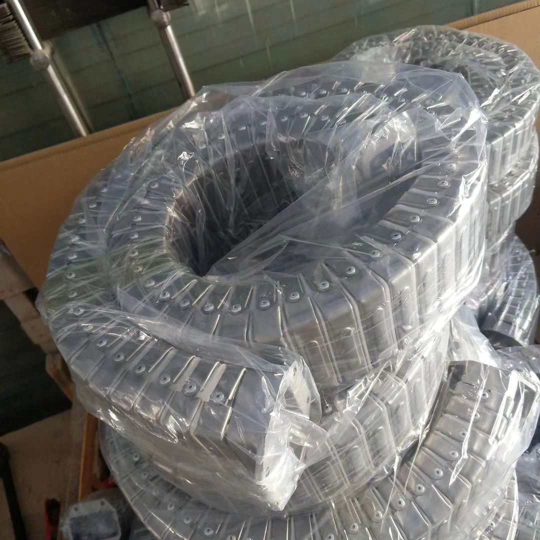 钢制拖链按支撑板形式分为整体式(打孔式)、上下分开式、框架式(隔离片式)。