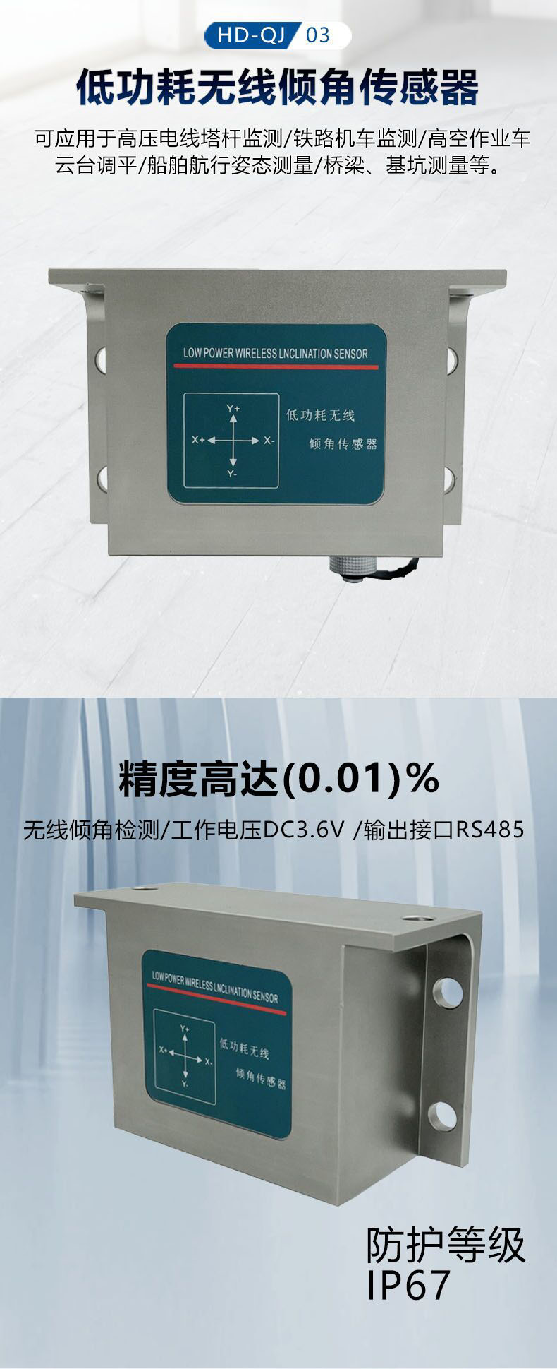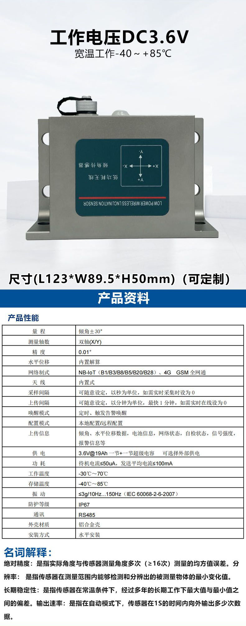 NB-LOT无线倾角传感器,4G GSM全网通无线倾角传感器,可联云平台监测