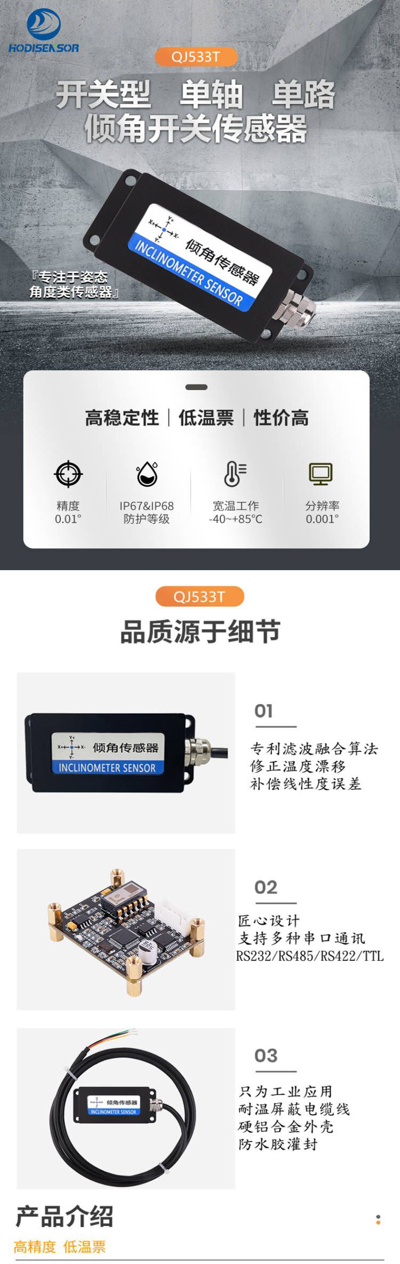 开关型单轴单路倾角开关,单轴倾角传感器,高精度0.01°、低温漂