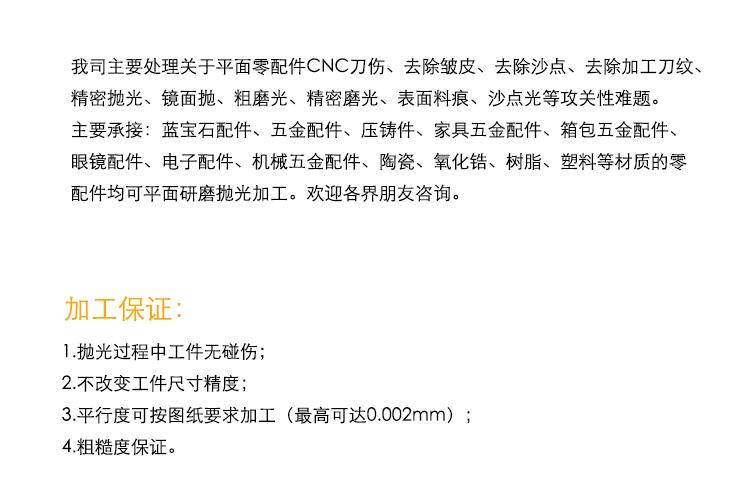 我公司主要承接:蓝宝石零配件、铝压铸件、锌压铸件、家具五金配件、箱包五金配件、眼镜配件、电子配件、各类首饰、珠宝及粉末冶金、树脂等。适用于不锈钢、铁、铜、锌、铝、镁 合金等材质经冲压、压铸、铸造、锻造;针对于线材、陶瓷、玉石、珊瑚、合成树脂、塑料、瓷器等材质物品均有不同的切削及抛光效果,有关于零件CNC刀伤,去除皱皮,去除沙点,去除加工刀纹痕,精密抛光,镜面抛,粗磨光、精密磨光、料痕,沙点光等攻关性技术难题,抛光中工件无碰伤,不改变工件尺寸精度,平面度可达0.002mm,粗糙度保证,根据客户要求加工。欢迎各界朋友咨询。