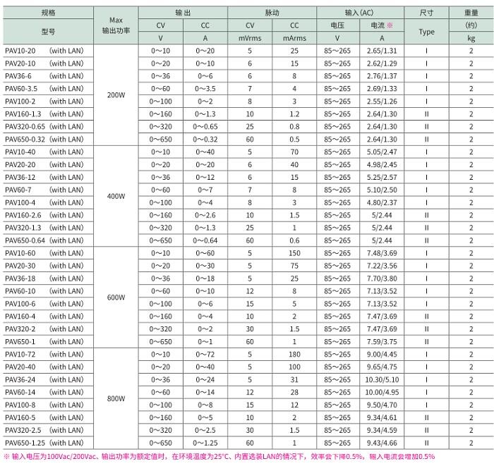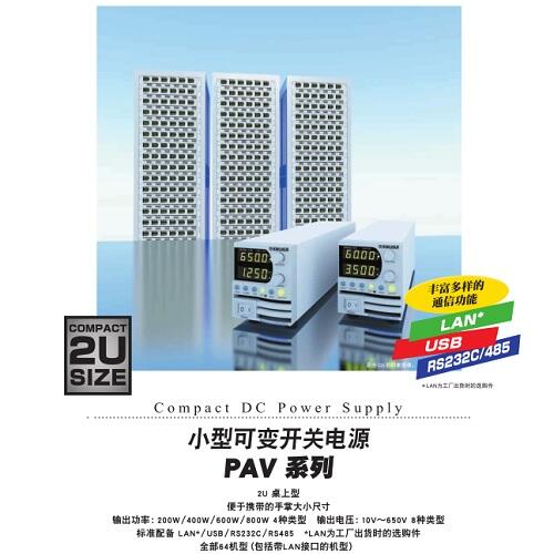 AV系列是高功率密度、高性能的超小型恒压(CV)/恒流(CC)直流稳定电源。Max输出功率为200W、400W、600W、800W共4种,输出电压为10V~650V,共有64种机型※1。以桌面使用为前提,所有机型的高度均为2U(88mm),是统一了尺寸的高功率密度规格。该系列不仅可以进行模拟控制,通过配备CPU,还可以进行时序设定。 还配备了扩展输出电流的并联运行功能(Max 6台)※2和同步运行功能※3。该系列还标配系统升级所需的USB、RS232C、RS485※4 通信接口。也可选装LAN接口※5。内置谐波电流抑制电路,功率因数为0.99,顾及到了电力环境。※1 包括附带LAN(with LAN)的机型 ※2 额定值相同的PAV系列 ※3 触发同步 ※4 需要另售的RS232C、RS485转换电缆。 ※5 出厂选装