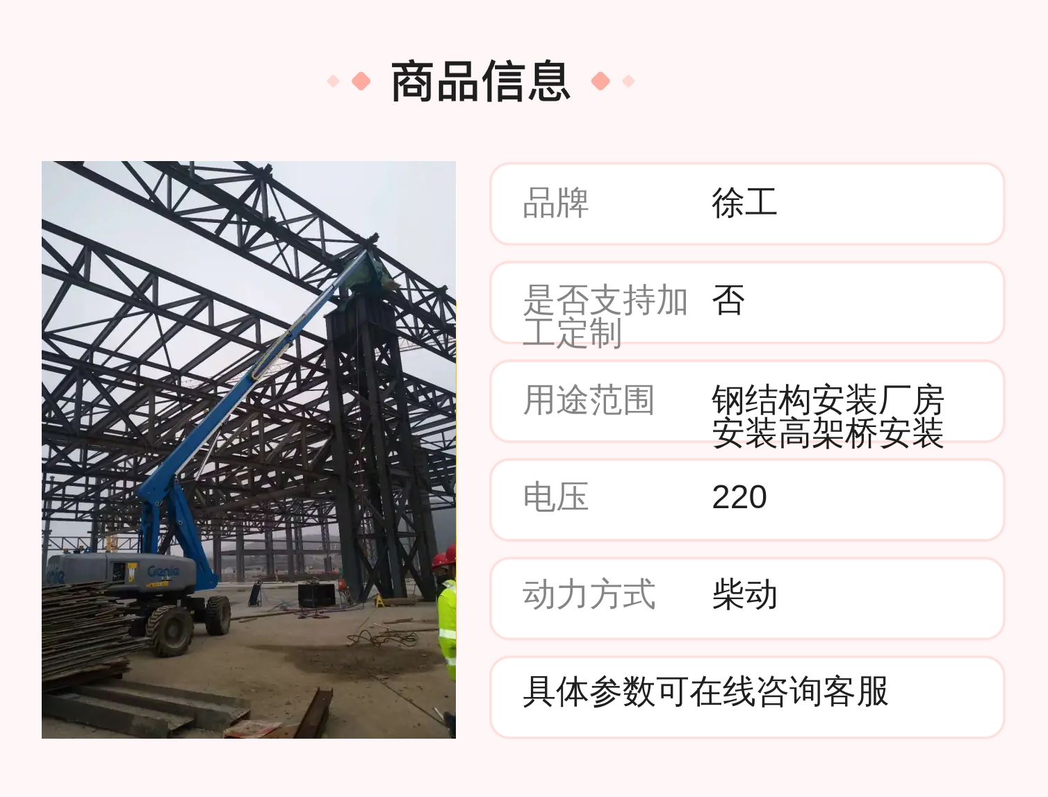 | 用途 | 钢结构安装、厂房安装、高架桥安装等 | ||
