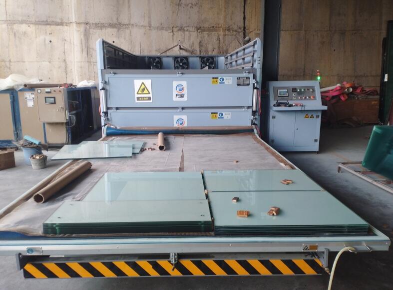 玻璃夹胶炉采用高温抽真空原理,在两片或多片玻璃中间放入胶片,经过炉内持续高温抽真空,使胶片和玻璃紧紧粘合在一起,透明度良好且无气泡,达到玻璃po碎后无掉落目的。
