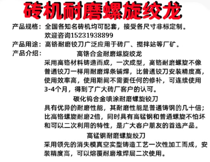 河北省邢台市清河县鑫凯耐磨焊接材料厂是一家“高科技企业”。本公司有着多年的生产经验,和完善的工艺配方,生产各种特种焊接材料,我公司的焊接材料以质量优,品种多,型号服务周到,深受广大拥护的信赖,产品销往,并运销国外。产品质量严格执行国 家标准。本公司秉承“顾客至上,锐意进取”的经营理念,坚持“质量”、“客户”的原则为广大客户提供的服务。欢迎广大国内外客户来人、来电、网上洽谈。主要产品:《砖机配件》 《矿山机械耐磨件》、《耐磨铸钢铸铁件》、《合金锤头》、《破碎机锤头》、《高锰钢锤头》、《高铬合金锤头》、《耐磨搅拌刀》,《陶瓷搅拌叶》,《复合耐磨搅拌刀》、《雾炮机》、《 洒水车 》、《车间喷淋》《耐磨焊条》、《不锈钢焊条》、《铸铁焊条》、《钴基焊条》、《阀门焊条》、《模具焊条》、《耐热钢焊条》、《镍及镍合金焊条》、《铜及铜合金焊条》、《铝及铝合金焊条》、《银焊条》、《银焊片》、《银焊丝》、《耐磨焊丝》《不锈钢焊丝》、《钴基焊丝》、《镍基焊丝》、《铜及铜合金焊丝》、《铝及铝合金焊丝》 可定做各种规格的 合金喷涂绞龙 高铬耐磨 砖机绞龙