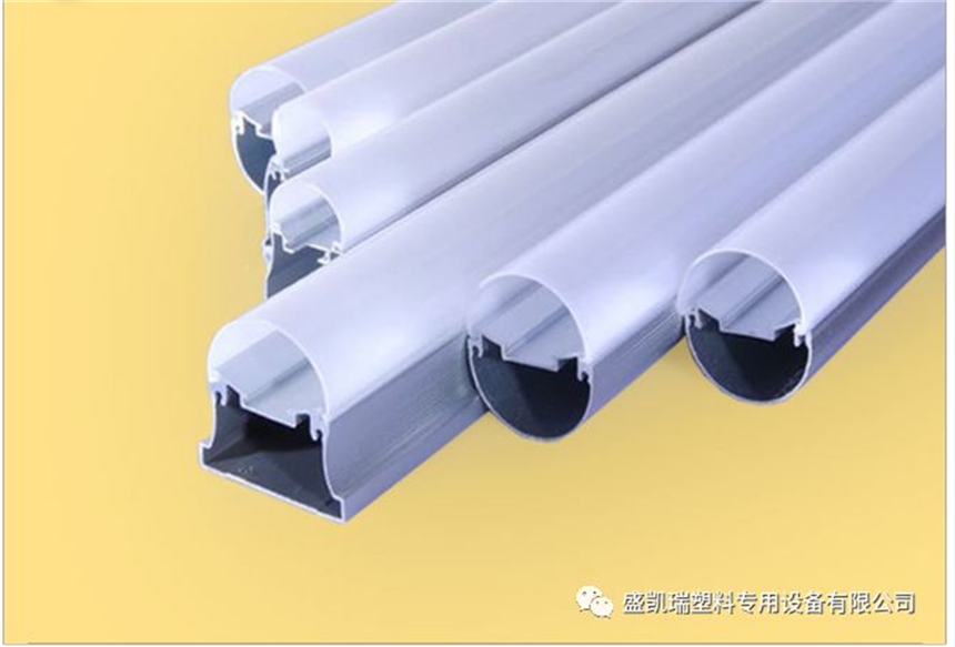 此款PC灯罩生产线主要用于生产T5 T8 和其他异型透明灯管/面罩/外壳,扩散灯罩产品,此类产品对整条生产线的稳定性要求非常高,尤其是主机挤出塑化稳定性,模具的精密程度,对PC/PMMA塑料制品的尺寸和表面光洁度影响非常大。我公司不断完善生产线细节,有效解决了表面拉痕,震纹等问题,这款PC灯罩生产线可稳定生产PC等异型材。生产线具有高塑化,透明度高,高产量,低能耗特点。生产线主要由:精密挤出机、三维移动的定型台、牵引机、切割机、堆放架等部分组成。主机采用高效排气挤出机,变频调速,依据各种规格的产品配置不同规格的主机;定型台采用不锈钢接水盘,真空泵;整机可以三维调整;牵引机为双动力同步驱动皮带式牵引机,切割长度采用定长切割;料架采用气动放料,该机可用于生产PC类,异型材,亚克力,灯管、灯罩等