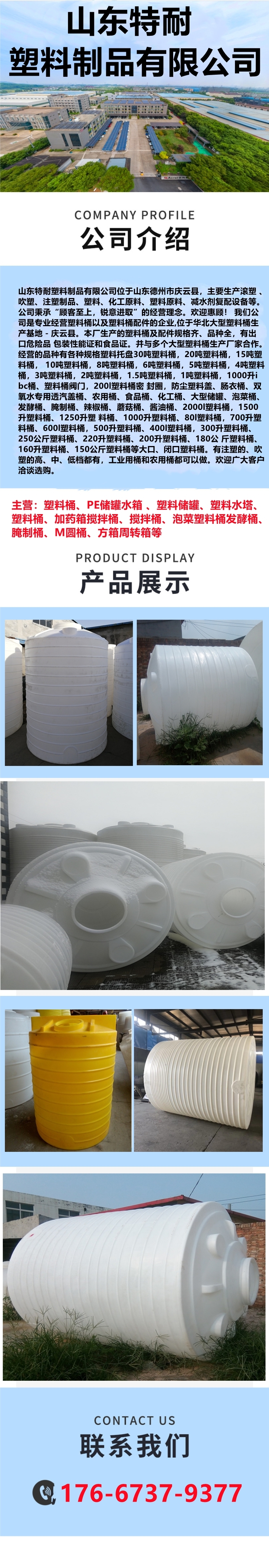 公司主营产品:耐酸碱塑料储罐,加药箱,溶盐箱,锥底储罐,食品级PE水箱,圆桶,PE方桶,周转箱,化工耐酸碱塑料水塔,搅拌桶储罐,卧式水箱运输罐,车载专用运输罐