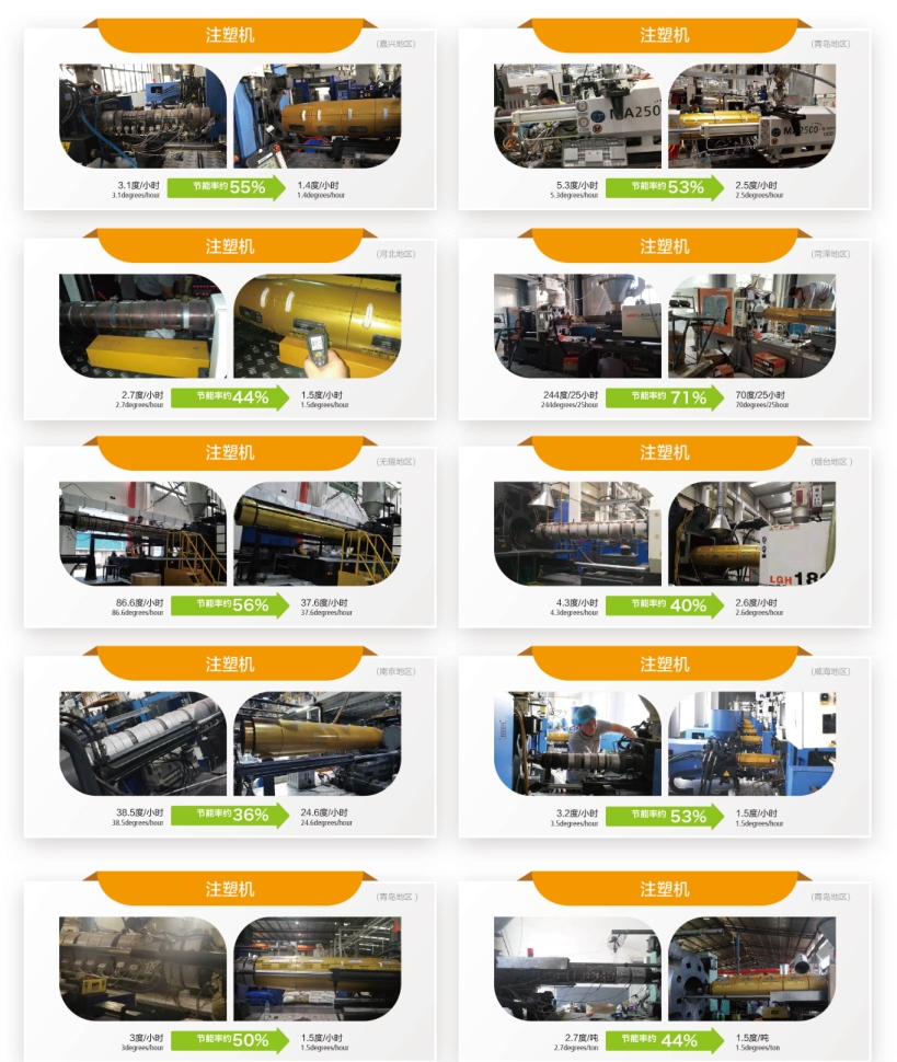 中邦凌注塑机加热系统节能改造只需要替换原有不锈钢加热圈、陶瓷加热圈,每个加热温控区使用一个节能加热圈(原来每个加热温控区有2-3个传统加热圈),不需要改变原来的温控和线路,不会影响注塑机使用寿命,不会影响产品品质,相反,由于升温速度快,会有效提升生产效率,由于节能加热圈内部使用的石英管没有热惯性,配合注塑机温控系统,温度控制更准确,可以有效提升产品品质。