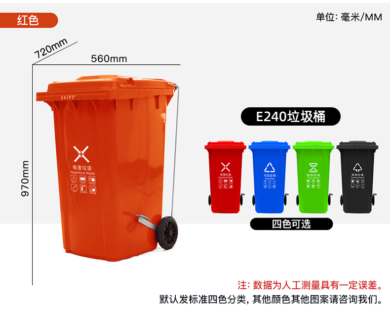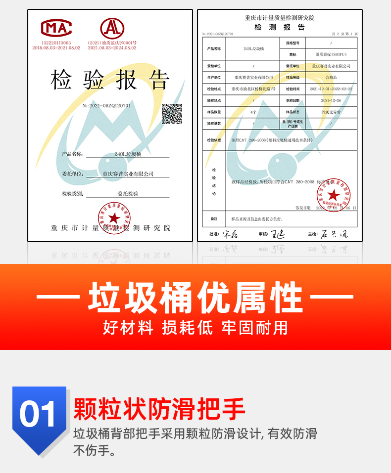 环卫垃圾桶产品特点:桶体四面加强筋设计,使桶身更加牢固,更耐用;桶身底部波浪形+蜂巢设计,更耐冲击;把手设有防滑颗粒装置,使搬运过程减少防滑几率,增加产品使用安全性;桶底把手人性化设计,让工人轻松翻倒垃圾桶。沿口蜂巢延长设计,桶内刻度线设计,垃圾袋挂钩设计,桶底16颗耐磨钉设计。
