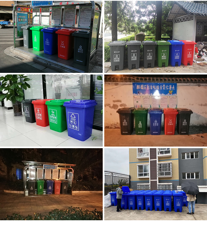 垃圾桶颜色及相对应垃圾分类:可回收物收集容器为蓝色,有害垃圾收集容器为红色,餐厨垃圾收集容器为绿色,其它垃圾收集容器为灰色。