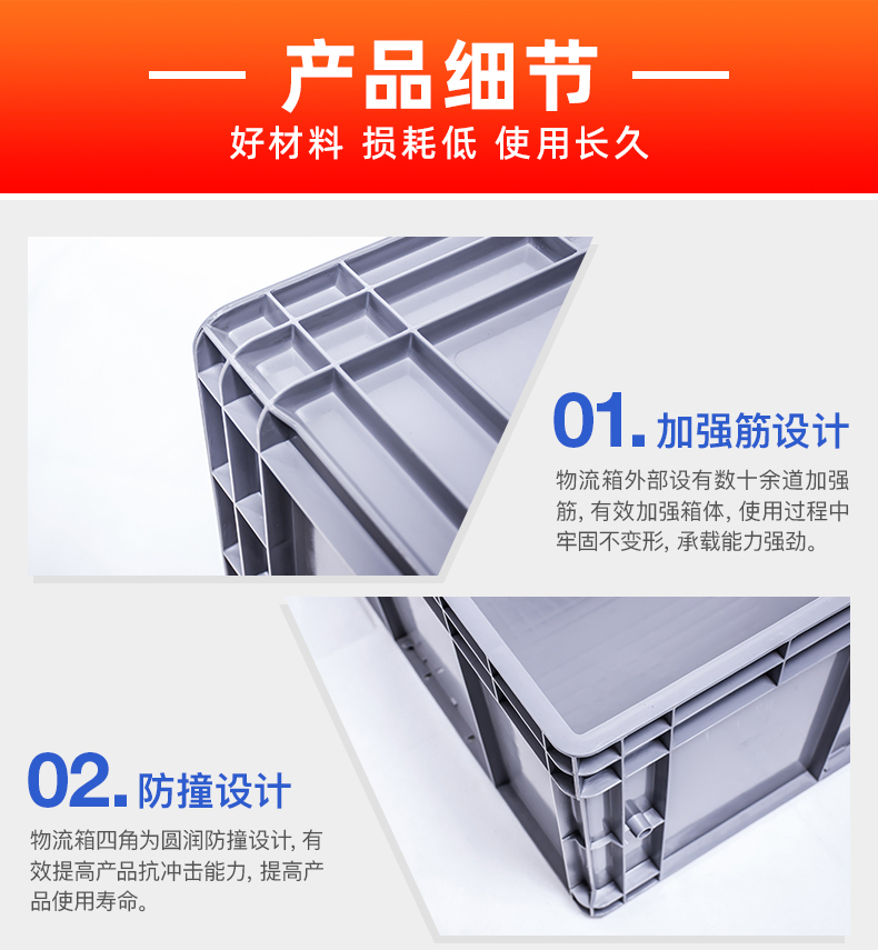 物流箱箱体加强筋设计,箱体四周包围数十条加强筋,加强箱体结构和承载能力,增加箱子的使用寿命。箱体四角防撞设计,增加箱体的抗冲击能力,也是箱体整体无尖角设计,一定程度上也保障了使用者的安全。