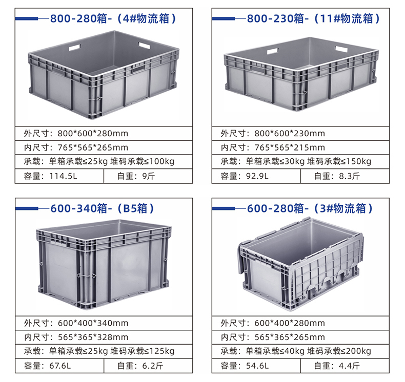 物流箱适用于服装、五金、机械、电子、化工、仪表、养殖业、食品、水产、物流仓储等行业,可用于盛放食品,清洁方便,零件周转便捷、堆放整齐,便于管理。其合理的设计,优良的品质,适用于工厂物流中的运输、配送、储存、流通加工。可与多种物流容器和工位器配合,用于各类仓库、生产现场等多种场合,周转箱帮助完成物流容器的通用化、一体化管理,是生产及流通企业进行现代化物流管理的必备品。