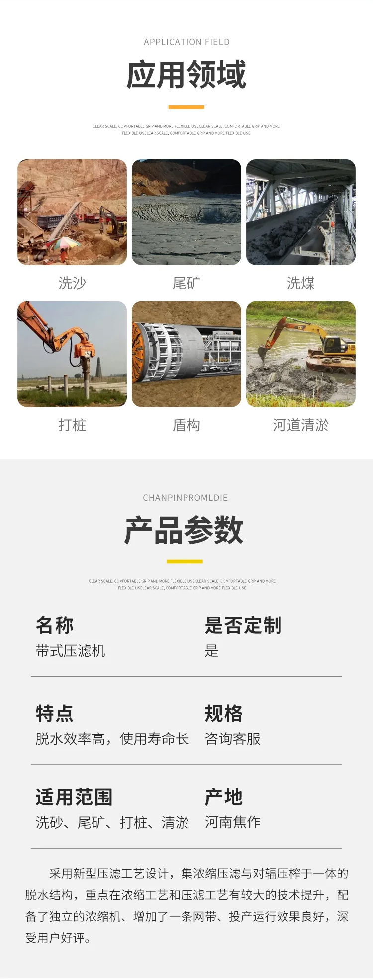 | 适用范围 | 广泛应用于城市生活污水、洗沙场污水 尾矿污泥 纺织印染、电镀、造纸、皮革、酿造、食品加工、洗煤、石油化工、化学、冶金、制药、陶瓷等行业的污泥脱水处理 | ||