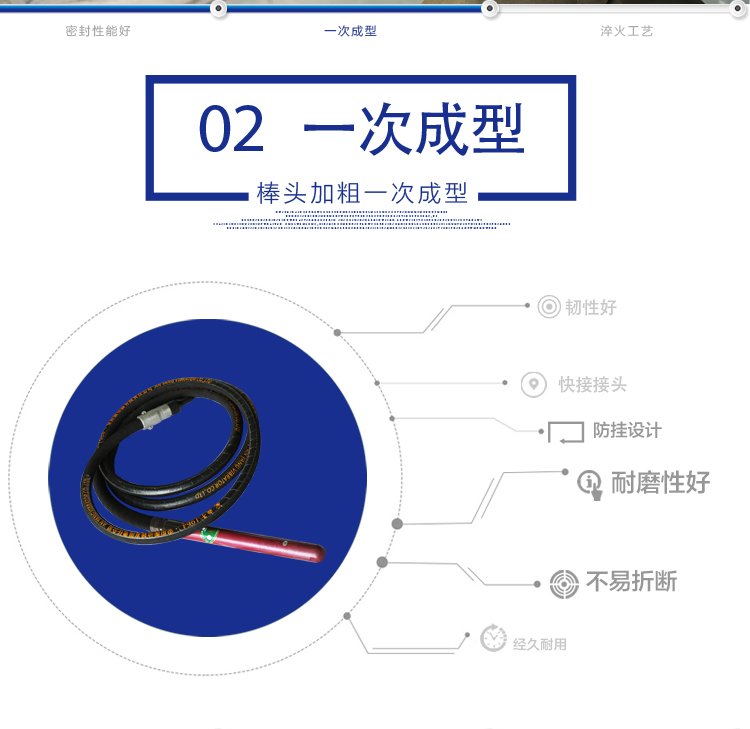 1、采用大功率盐炉淬火工艺处理尖头,确保其内外硬度一致(淬火深度为高频淬火的7倍以上),耐磨性极好。一般振动棒采用的高频深度仅为1.5-2mm,属表层淬火。滚锥采用优质钢材40Cr,经深层淬火,精密磨削,使振动棒激振力最佳,使用寿命最长。