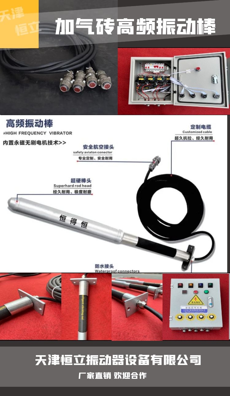 天津恒立振动器设备有限公司生产的加气砖气泡整理机 高频振动棒 智能振动器。智能加气砖高频棒及控制系统,又名加气砖气泡整理机,整套产品由总控箱一个,控制箱3-5个,振动棒12-20根组成。加气块混凝土是一种轻质多孔、保温隔热、防火性能良好、可钉、可锯、可刨和具有一定抗震能力的新型建筑材料。一般重量为500-700千克/立方米,只相当于普通的的1/4-1/3,普通混凝土的1/5,是混凝土中较轻的一种,适用于高层建筑的填充墙和低层建筑的承重墙。使用这种材料,可以使整个建筑的自重比普通砖混结构的自重降低40%以上。由于建筑自重减轻,地震破坏力小,所以大大提高建筑物的抗震能力。 每个好的建筑都是由优质的建筑材料,质量轻的建筑材料,这样降低了自重,有很好的效果!