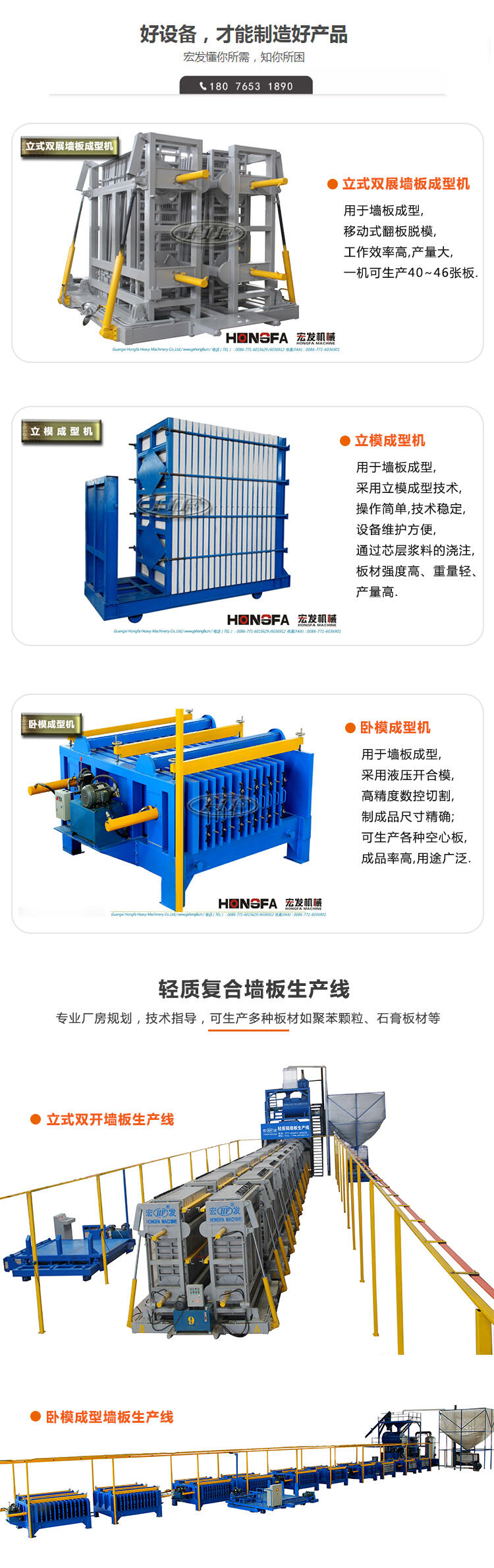 广西宏发生产的轻质复合墙板机,采用先进的循环流水线生产,设备机械自动化代替大量人工,同时降低劳动成本集成化控制减轻劳动强度提高生产效率。宏发机械可根据客户需求,制造不同类型的设备。尺寸可根据您的需要调整,免费提供生产技术材料配方,负责培训技术工人,以及各种材料选购,完善的服务体系,让您购买无忧。