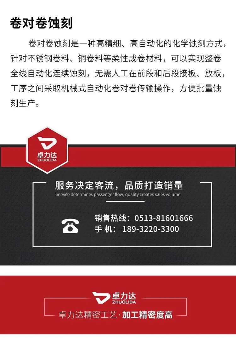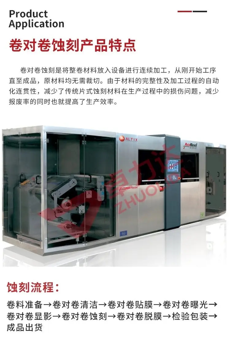 | 工序 | 卷料准备-料带连续清洁-料带连续贴膜 -料带连续曝光-料带连续显影-料带连续蚀刻 -料带连续脱膜-料带蚀刻在线 检验-成品质验 -包装出货 | ||