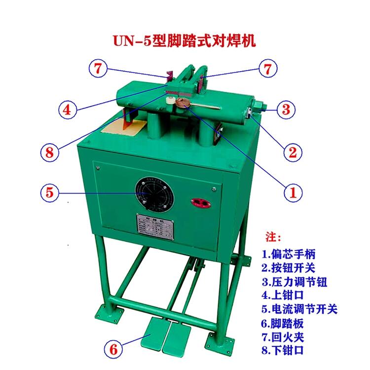 UN-5型脚踏式对焊机,机械部分采用脚踏式夹线结构,操作方便快捷,双手各拿住两根要焊接的线材很容易对正,滑动部分采用直线滑轨,对位准确,滑动灵活,焊接速度快等特点。变压器由全铜线包制作的,性能稳定、使用寿命长。机身底部装有万向轮,移动灵活方便。