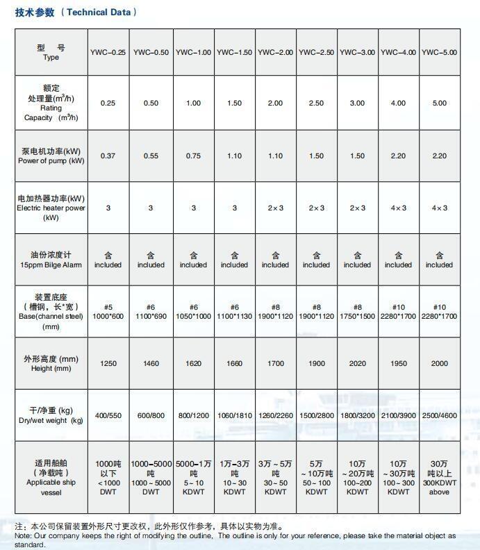 YWC型系列油污水处理装置共九个规格型号,最小的YWC-0.25(z)可以配置于1000吨以下的船舶,最大的YWC-5可以配置于30万吨以上的大型船舶,整个系列图纸和装置均已通过中国船级社的型式认可试验,整个系列图纸和装置均已通过德国劳氏船级社(GL)EC型式认可,具体型号如下:YWC-0.25,YWC-0. 5,YWC-1.0,YWC-1.5,YWC-2.0,YWC-2.5,YWC-3,YWC-4,YWC-5. 根据用户的需要,我们可设计生产特殊要求的油水分离装置。15ppm舱底油水分离器的技术条件被认为适用于含油性的机器所在舱底水燃油舱的压载水使用.要求能对船上可携载的各种油都有效,包括密度极高的油或乳化液形式出现的混合物,以及可能会使舱底水乳化的清洁工作所用的清洁剂,乳化剂,溶剂或表面活性剂。本装置除适用于船用舱底油污水处理外,还可用于工矿企业的油污水处理,其排放标准完全符合我国环保部门的有关要求
