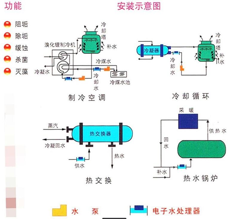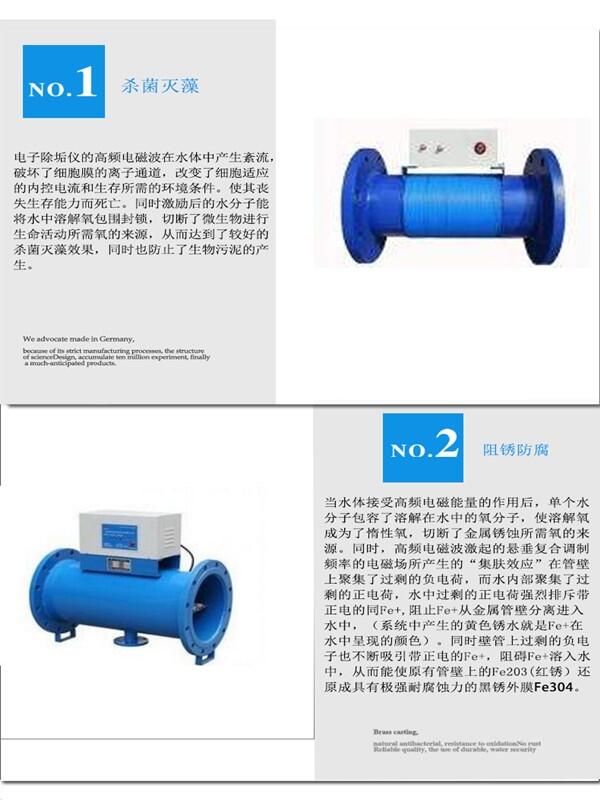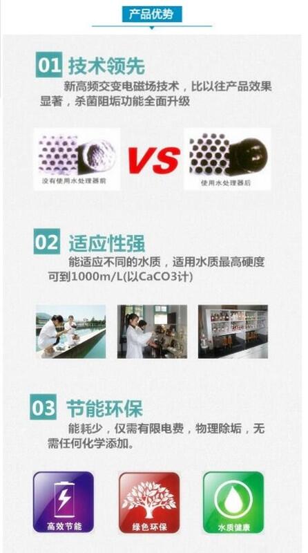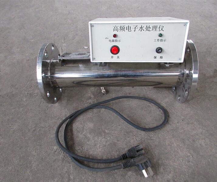 水中溶解盐的正负离子被单个水分子包围,运动速度降,有效碰撞次数减少,静电引力下降,从而使水中的钙镁离子无法与碳酸根离子结合成碳酸钙和碳酸镁,进而达到防垢的效。同时由于水体吸收大量被激励的电子,使水体的距增大,与盐的正负离子的亲合能力增大,从而使管壁上原有的水垢逐渐松软以脱落,达到有效的除垢效。