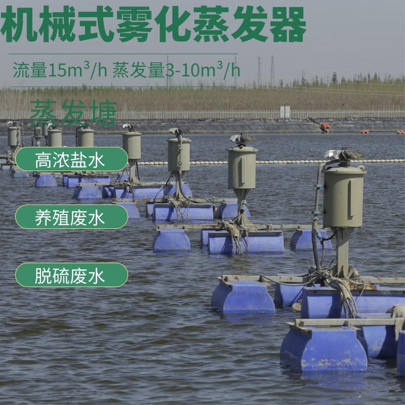 机械雾化蒸发技术优势;广泛意义上的零排放处理技术;运行管理灵活机动、可靠性高;水分蒸发对周围生态环境影响小;蒸发效率高,是自然蒸发效率的5~20倍;蒸发塘单元化,易于完成盐分等颗粒物的收集与处理;可适于常/低温蒸发,设备简单,易于安装、运行、管理;可显著减小蒸发塘占地面积,节约大笔资金投入。合理配置蒸发器所使用水面积是依赖自然蒸发塘面积的10~30%;投资少见效快。不需加热蒸发,吨水耗电4~5KWh,运行成本极低;为高效、节能、环保、可靠、经济的高盐水处理解决方案。机械雾化蒸发技术,机械雾化蒸发技术是一种通过工业化的专业机械雾化蒸发器(Enhanced Evaporator)利用蒸发塘将各种水雾化喷入大气,增加雾化水滴在大气中的比表面积和“悬浮时间”加速水的蒸发效果的技术。机械雾化蒸发器采用国内先进特有喷嘴,将水流雾化成极小的水滴,水滴直径可达100μm以下,大大增加水滴与空气接触的比表面积,加速水分蒸发大大减小蒸发塘占地;同时,喷嘴雾化独特工艺设计保证盐分、游滴等颗粒及大分子**物的集聚回落至蒸发塘饱和收集单元,便于结晶盐等固体颗粒的收集与采掘。机械雾化蒸发技术是一种“增强型“的自然、生态与环保蒸发技术,对周围环境无影响且能提高周围的水环境生态。同时,大规模进行的机械雾化蒸发甚至能间接局部改变当地的气候环境。