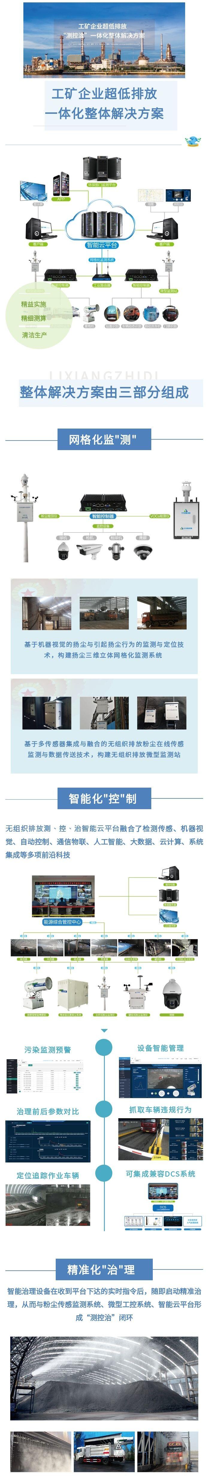 九九智能环保工矿企业超低排放智能解决方案。该解决方案由九九智能环保自主研发的智能监测设备、智能治理设备、智能云平台组合而成,采用云计算+边缘计算+设备终端结构模式,根据工业企业粉尘排放规律和各项除尘技术特点,融合了检测传感、机器智能识别、云计算、通信物联以及大数据分析等多项前沿科技,通过对工业企业无组织粉尘排放的网格化监测、智能化控制、精准化治理,形成了一套简单易操作、空气治理效果以数据为参考的整体解决方案,可广泛应用于钢铁、焦化、电力、建材、矿山、散货码头、建筑、垃圾消纳场等行业的无组织排放智能管控和治理。