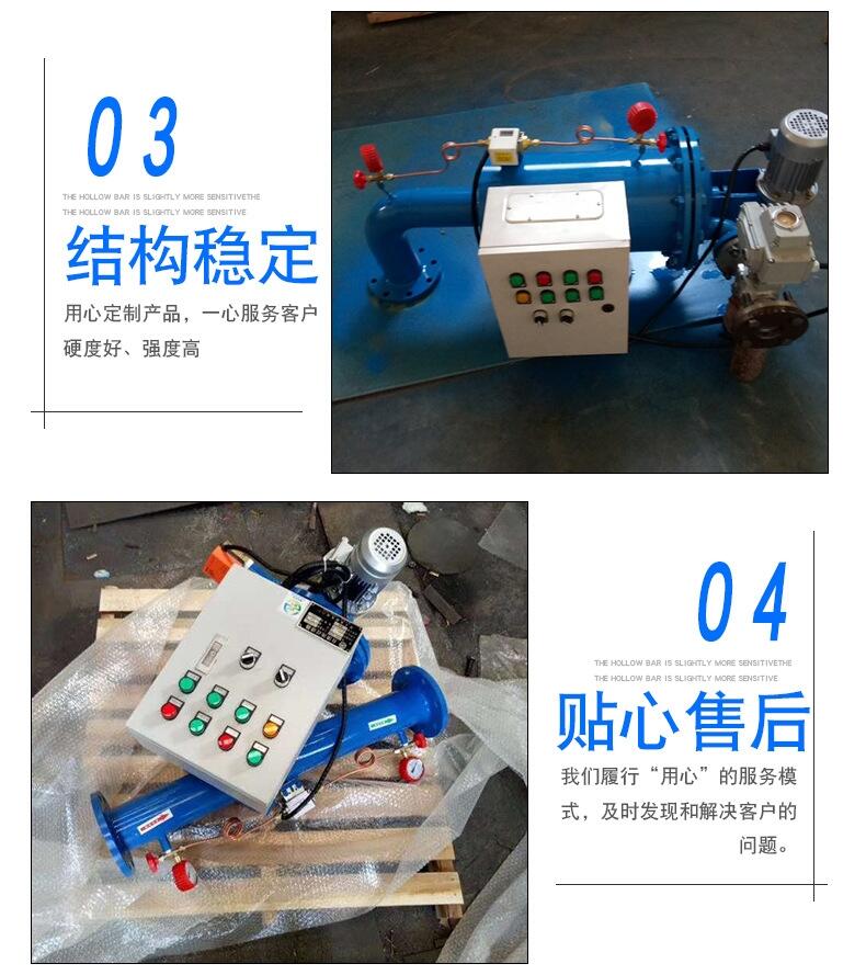 自清洗过滤器是一种利用滤网直接拦截水中的杂质,去除水体悬浮物、颗粒物,减少浊度,净化水质,减少系统污垢、菌藻、锈蚀等产生,以净化水质及保护系统其他设备正常工作的精密设备,水由进水口进入自清洗过滤器机体, 由于智能化(PLC、PAC)设计,系统可自动识别杂质沉积程度,给排污阀信号自动全排污。