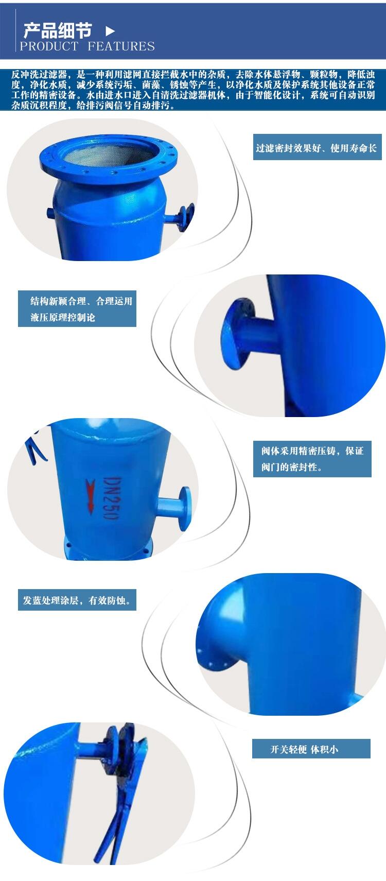 自动反冲洗过滤器自动清洗在预设压差或反冲间隔时间到达时排污阀自动打开,反冲程序开始。在电机驱动下反冲吸口沿细滤网表面螺旋转动。滤网表面积聚的颗粒杂质经由反冲进入吸口,然后经排污阀流出。反冲持续时间约 40 秒到 1 分钟。