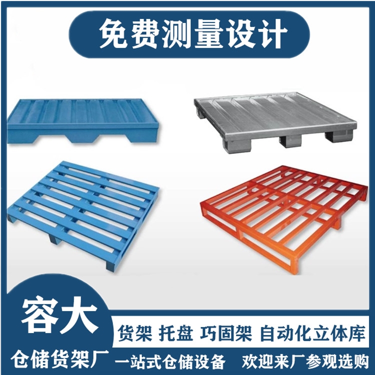 钢制托盘又叫金属托盘或铁托盘钢制托盘(钢托盘)适合叉车作业,存取货物方便。主要用于多用途的地面存储、货架存储及货物联运、周转等超轻金属托盘系列。集装、堆放、搬运和运输的放置作为单元负荷的水平平台装置。是现在工业重要的仓储与运输辅助设备。主要材料为钢材或镀锌钢板,经专用设备成型,各种型材互相支撑,铆钉连接加强,再经CO2气体保护焊焊接而成。是一种用于机械化装卸、搬运和堆存货物的集装箱单元工具,