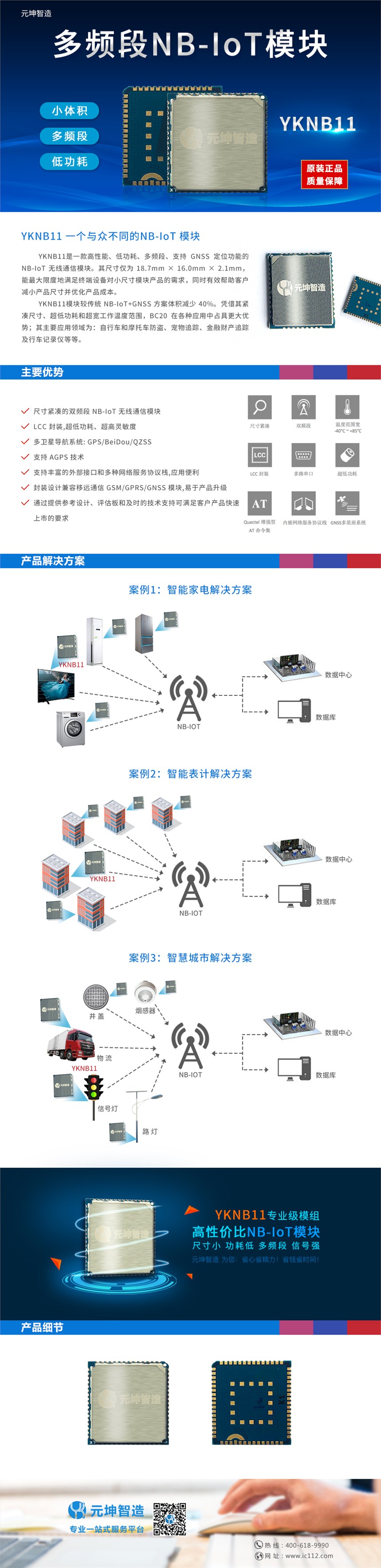 YKNB11是一款高性能、低功耗、多频段、支持GNSS定位功能的NB-IoT无线通信模块。其尺寸仅为18.7mm×16.0mm×2.1mm,能最大限度地满足终端设备对小尺寸模块产品的需求,同时有效帮助客户减小产品尺寸并优化产品成本。