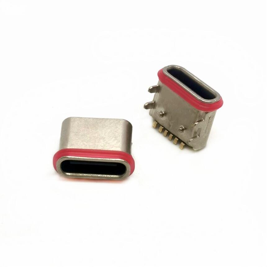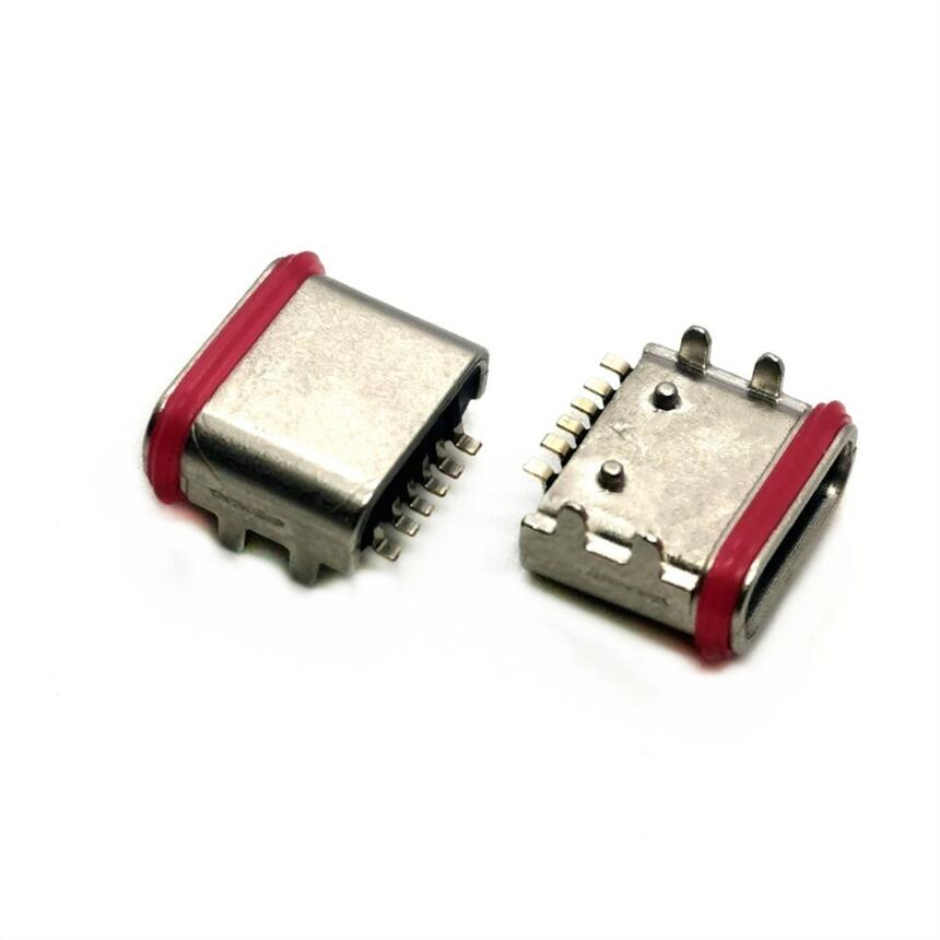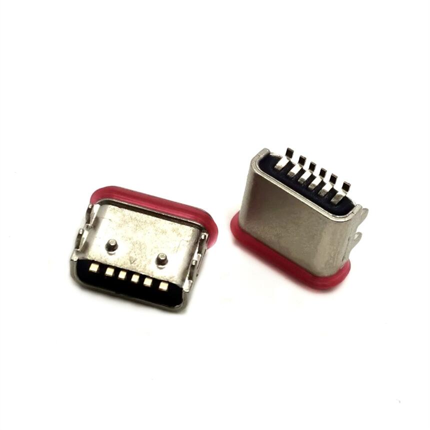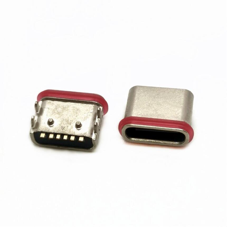 TYPE-C母座 板上6PIN防水 四脚插板DIP 后定位柱 带胶圈 粉末冶金