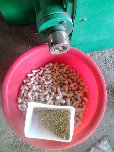 切粒部分,切粒大小由出粒孔而定,要想彭化一般4.5公分,孔子开4-5个,要想产量高,不彭化可开10-15个孔,小电机可前后调整,刀在顺向,下料时先用3-5市斤饲料加多水做起头。
