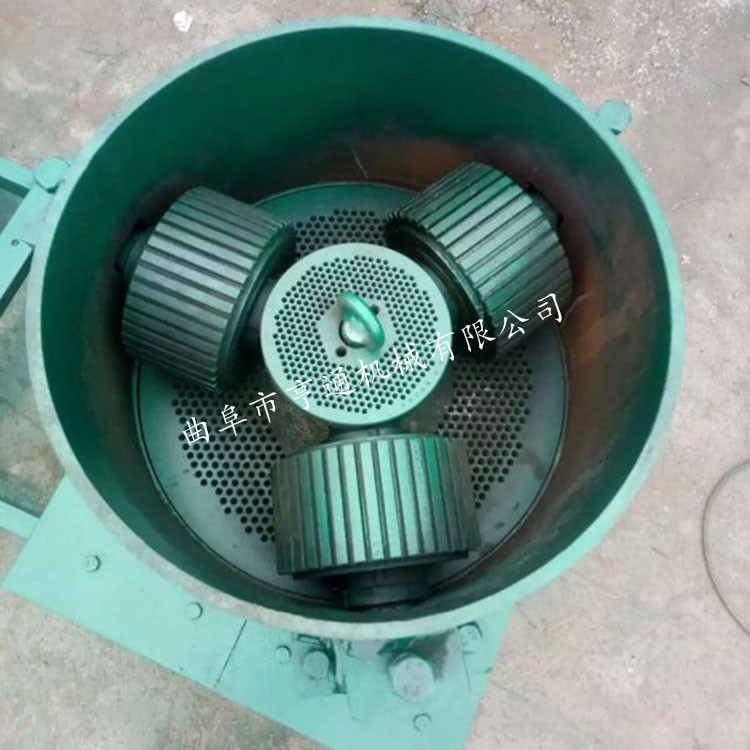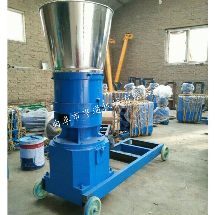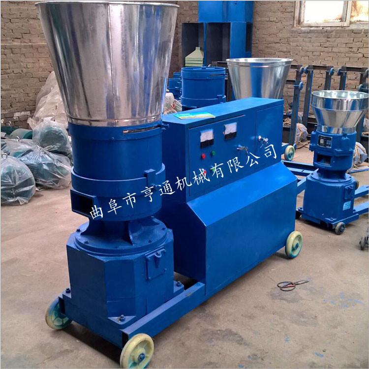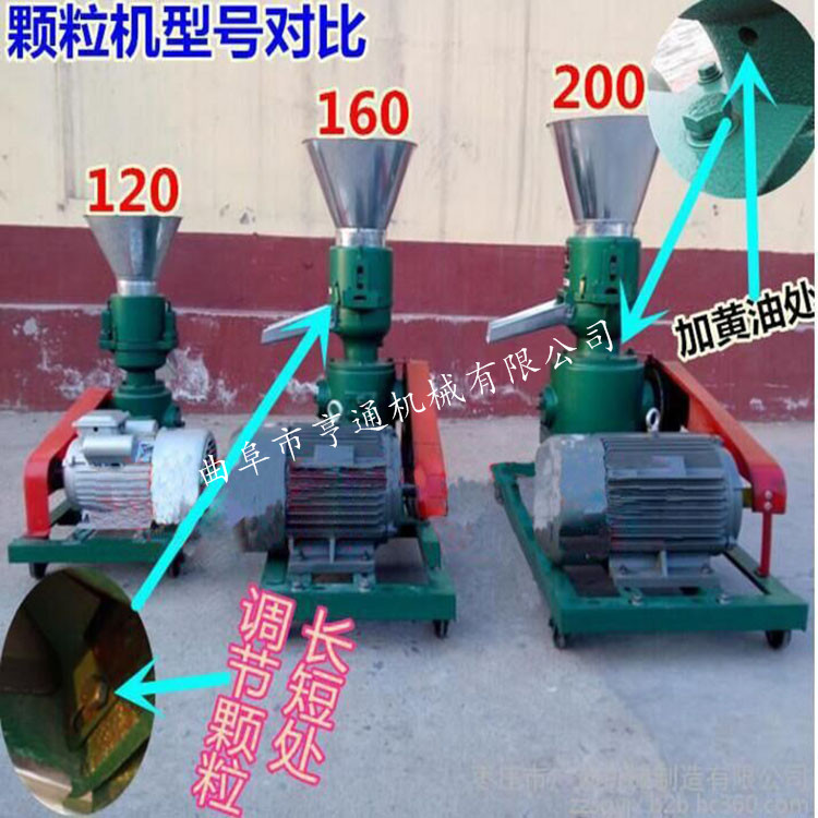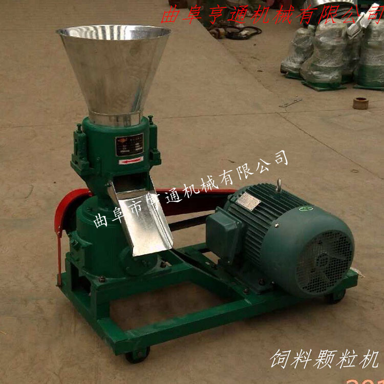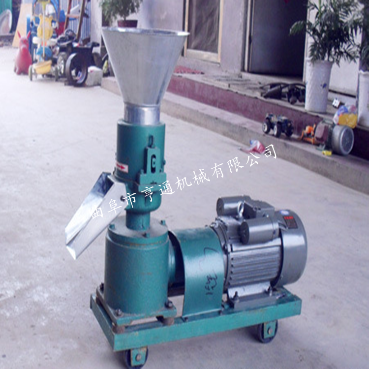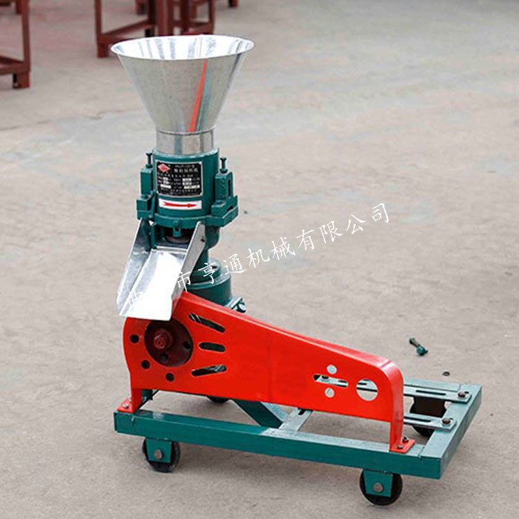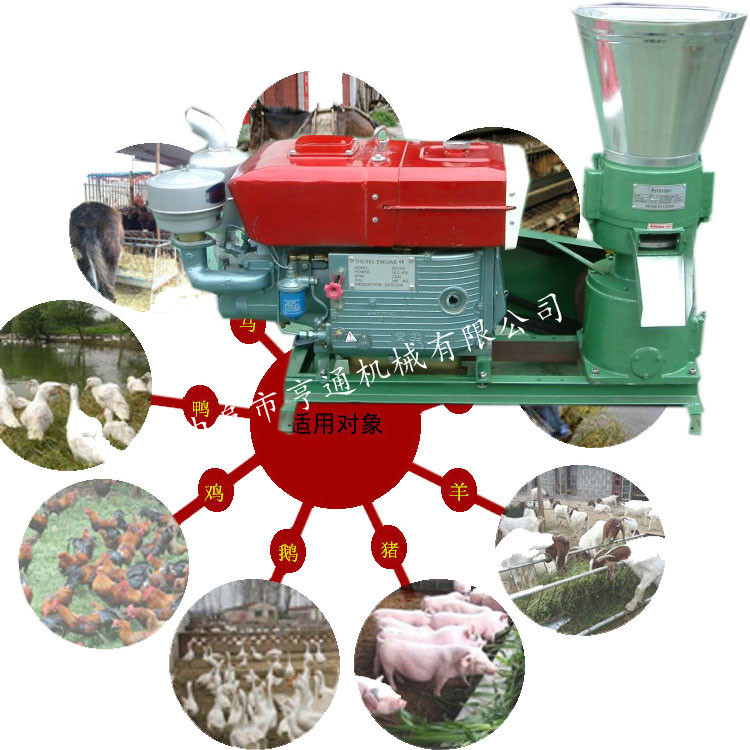 机器介绍:本产品采用模板、压辊采用优质合金钢经特殊处理,主轴及平模在摩擦力作用下,带动压辊自转,压辊与模板产生高温使淀粉熟化,蛋白质变性凝固,在压辊挤压下从模孔中排出,颗粒经甩料盘送出机外,通过调节切刀角度可控制颗粒长短 主要适用于中、小规模养殖专业户等加工制作各种畜禽及水产颗粒饲料,可降低养殖成本。