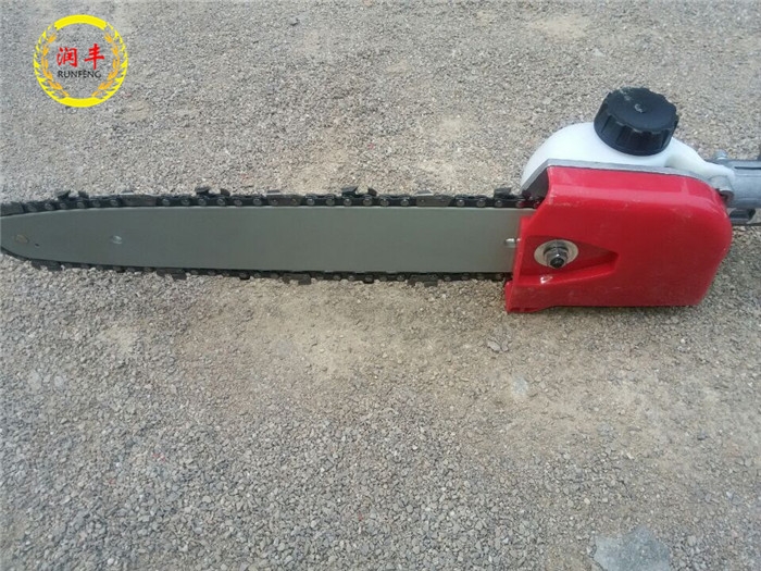 高枝油锯用于森林采伐、造材、打枝等以及木场造材、铁路枕木锯截等作业。尤其适用于高处危险之地的修剪.该产品具有功率大、振动小、锯切效率高、伐木成本低等诸多优点。已成为我国林区手持式采伐主导机械。该产品可任选其中一个工作头,如割草机头、割灌机、高枝油锯、绿篱剪四种用具。此产品携带方便,使用简单,具有此四种功能,可选购多功能高枝产品,四合一,三合一产品。
