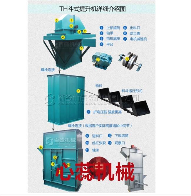 斗式提升机不能输送质量比较大,粒度比较大的物料,凡是经过斗式提升机的输送的物料都是是经过破碎机破碎过的一些物质。例如:石灰石、煤、石膏、熟料、干粘土等块粒状物料以及生料、水泥、煤粉等粉状物料。斗式提升机多采用的是离心式的方法和重力式卸料的方式,适合输送块状和粉状的物料。它的牵引构件有环链、板链和胶带等几种,对于这些构件在不同的物质在温度方面也会有不同的要求,如果是普通胶带物料温度不超过六十摄氏度,夹钢绳胶带允许物料温度达八十摄氏度,耐热胶带允许物料温度达一百二十摄氏度,环链。这些东西的严格要求自然也就说明了在物料上的选择也是物料有一定的要求的。