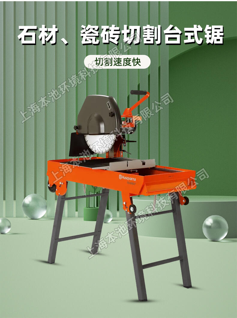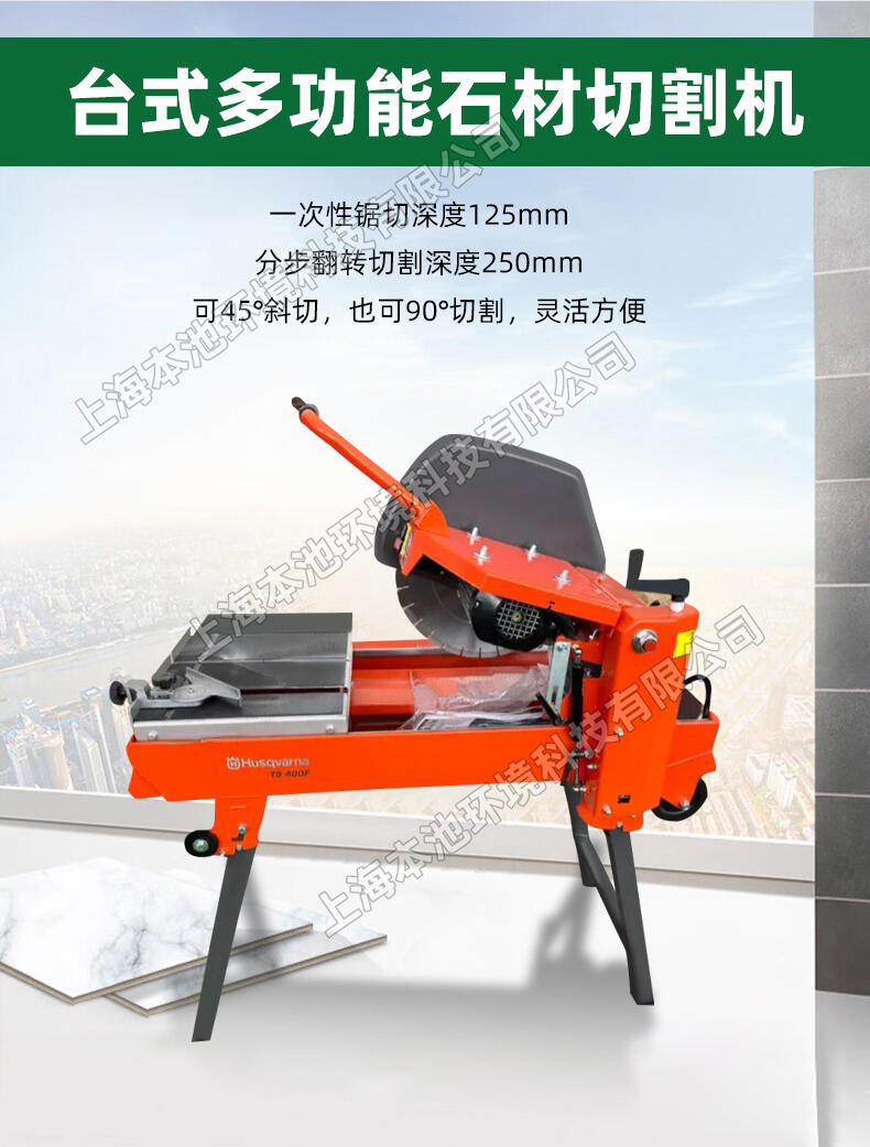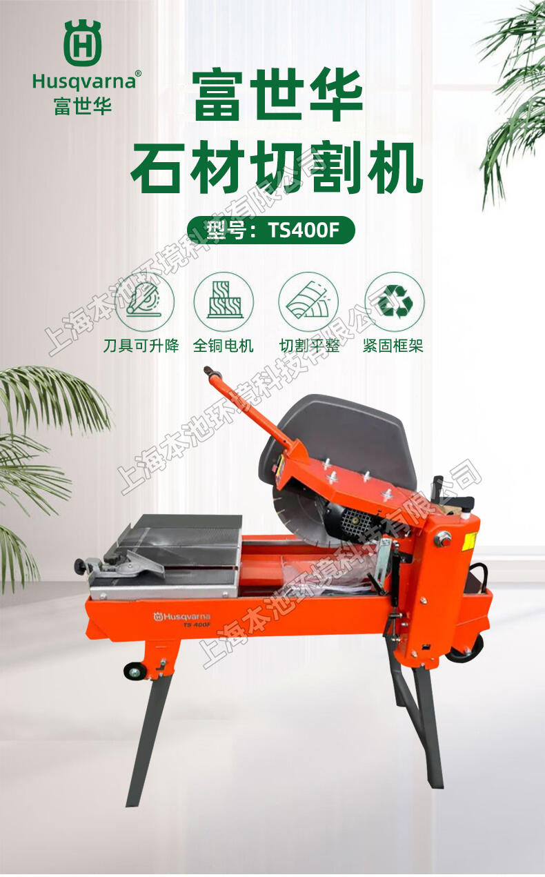 Husqvarna富世华/胡斯华纳TS400F石材锯 台式锯 石材切割机,它锯切能力强,适用于锯切各种砖和建筑砌体。 采用这种台式锯,一次性锯切深度可达125mm,分步翻转切割深度可达250mm。可45°斜切,非常灵活。坚固结实的整体式框架,配有一体化的输送轨道,刚性好。机器装有可折叠的支腿,单人操作方便。
