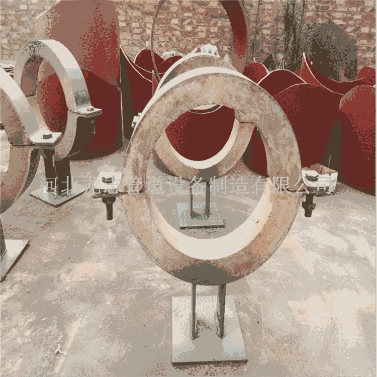 隔热材料的选取可根据实际管道应用的温度以及环境采用不同材料。其中比较常见的有蒸汽管道专用的耐高温蛭石隔热层,热水管道用聚氨酯隔热管托,以及耐低温阻燃型聚异氰尿酸脂聚氨酯隔热管托。经过多年生产实践与研究机构的多次合作,在传统绝热材料配方的基础上。开发出了以多种硅酸盐混合物为基础骨架原料,配以辅料,经过严格的配比混合静压成型烘干检验等多道工艺加工而成。成型后的绝热材料具备硬度高、强度好、导热系数小等特点。隔热管托可分为多种形式,例如滑动管托,固定管托和导向管托。对于滑动管托,底座和管托之间的摩擦系数也是影响管托参数的重要性能指标。不锈钢板改性的PTFE板用于接触。这样做的目的是很大程度地减小管托和底部滑板之间的摩擦。隔热管托一般安装于室外化工管廊上,工作环境中除有常规的大气腐蚀外,还伴有少量的化学物质腐蚀。若管托外部不采取特种防腐处理措施,往往使用一年其外表就锈迹斑斑,这不但影响整条管廊的外观形象,缩短其使用寿命。