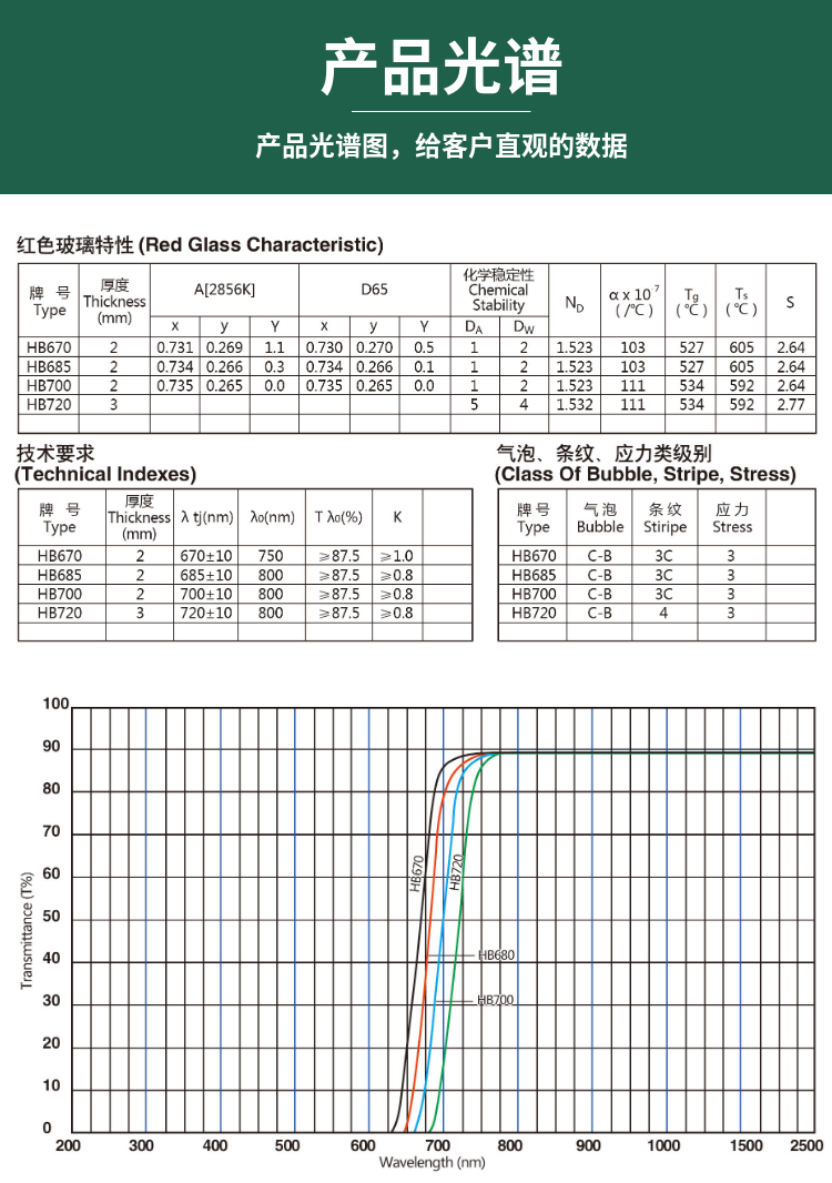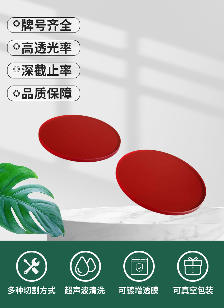 4.此系列有多种型号,均是透过红色光波段,不同型号颜色不一样,透过的波段也不一样,有些型号的颜色非常接近,不应以颜色作为选型的依据,请结合实际应用确定需要透过的波段来选择合适的牌号。