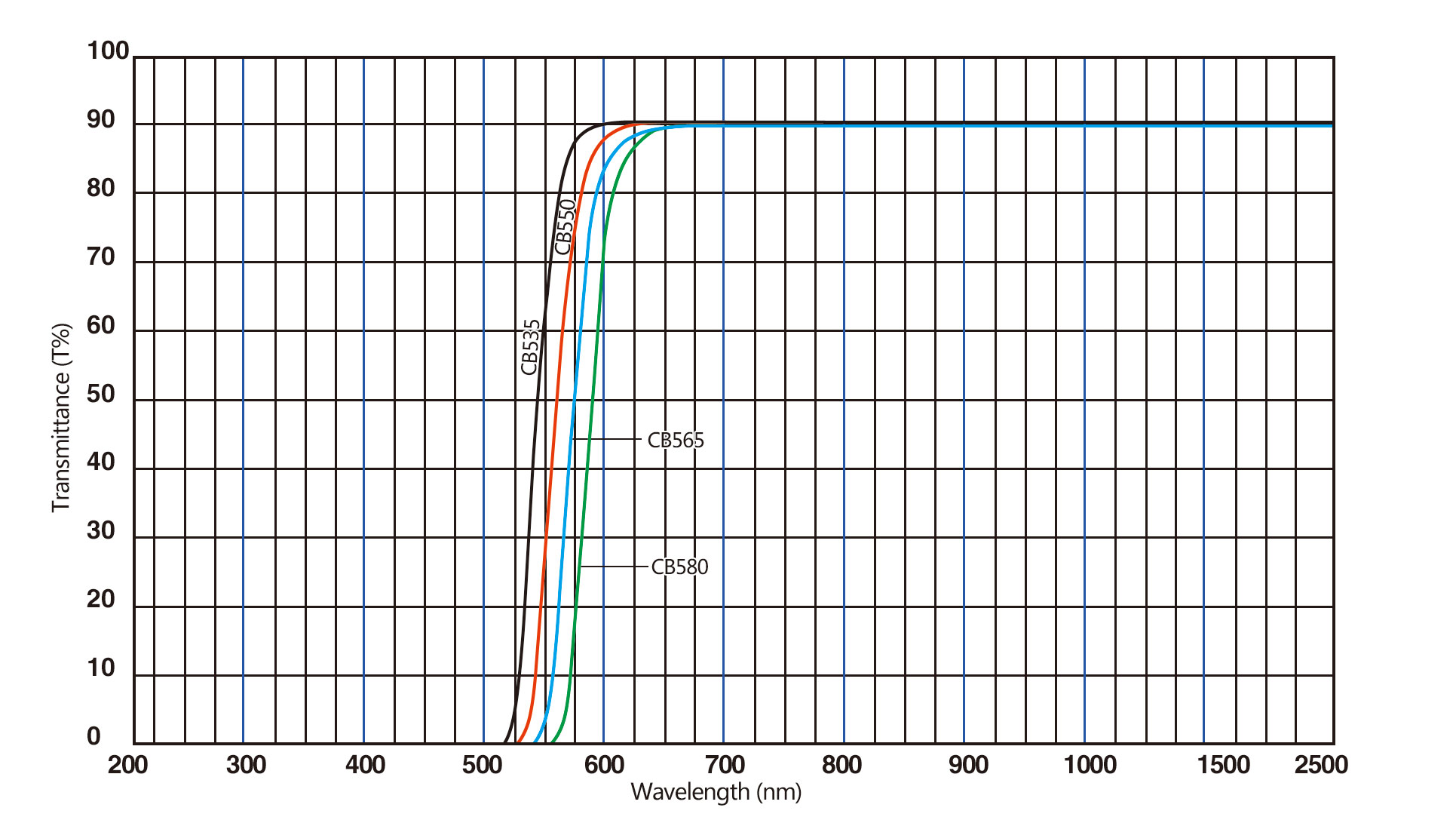 有色玻璃橙色滤光片为截止型滤光片,在吸收某一波长(535nm/550nm/565nm/580nm)之前的光谱,透过其之后的光谱,对不同入射角度入射的光束,滤光片的中心波长保持不变,是一款经济型的长波通滤光片。