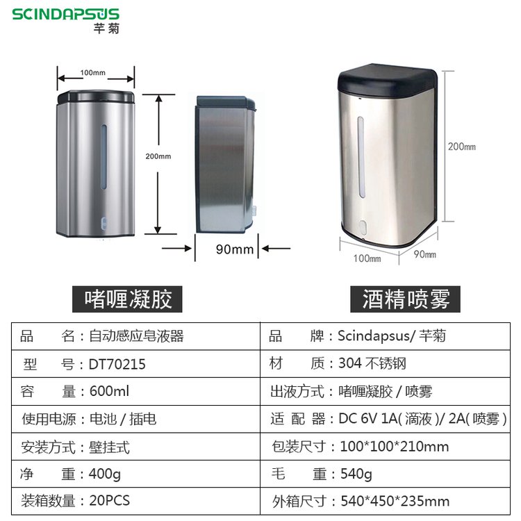 600ml不锈钢自动酒精喷雾消毒器智能感应双电源壁挂式消杀设备