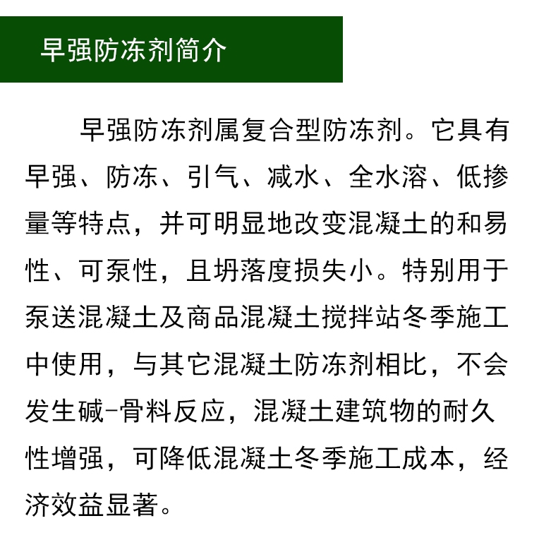 本品具有早强、防冻、泵送、低碱、无氯等特点。是负温水泥混凝土的理想添加剂。