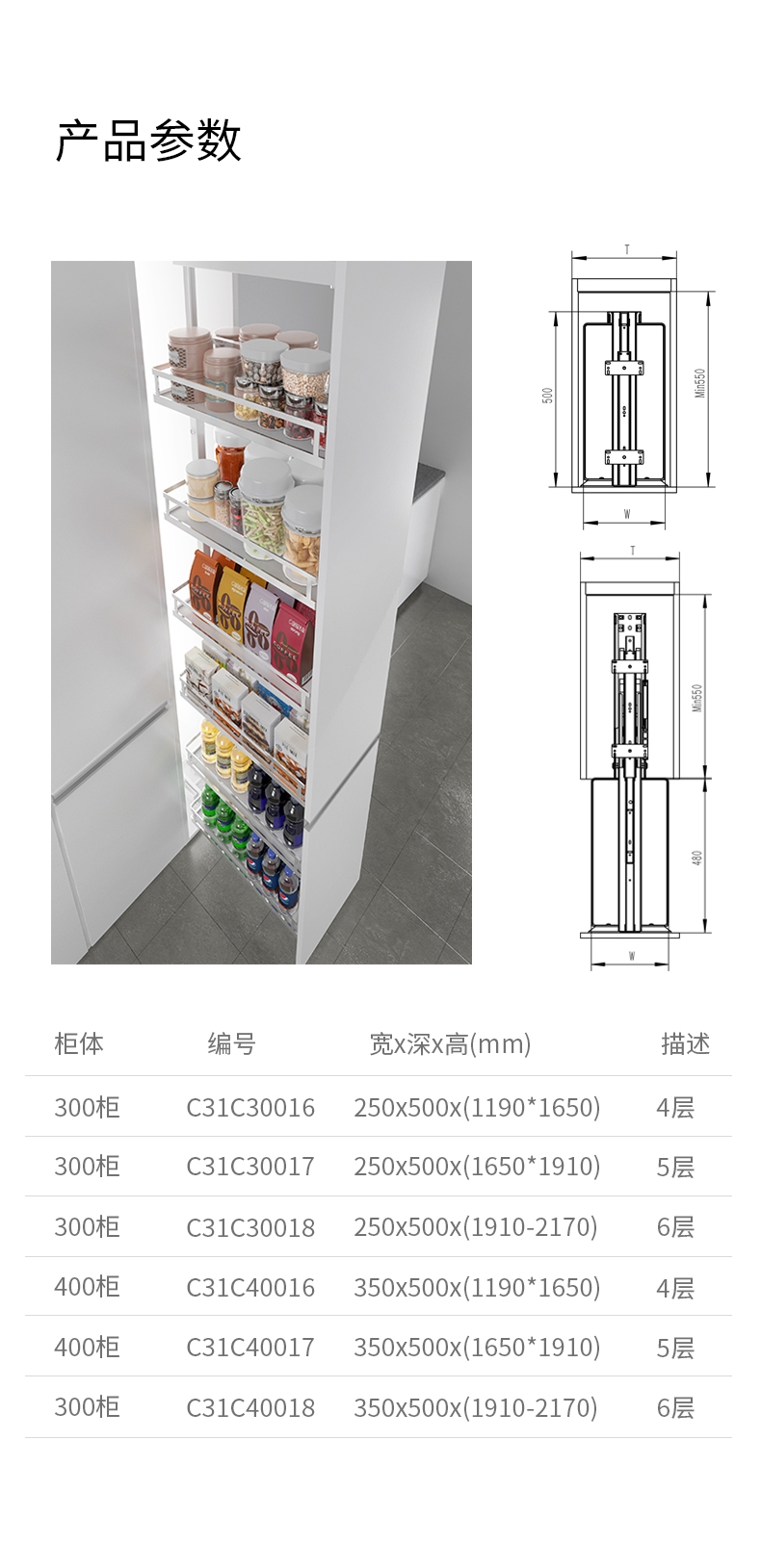 重型阻尼滑轨,可载重重120KG,单层篮子建议存放10KG。