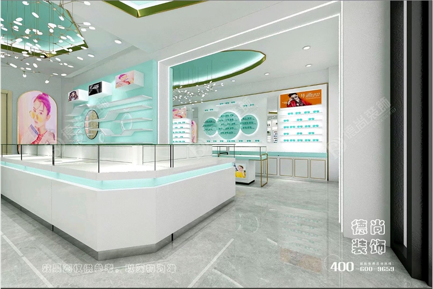 案例赏析:该眼镜店整体颜色采用金属色+简约白+薄荷绿相结合,展柜金属框架的质感轻松地演绎出奢华精致的感觉。不同于以前的富丽堂皇,大面积简约白和薄荷绿更衬托出空间的简约和非凡的品质。大气的展柜造型和简约的空间颜色,让最终效果在“简“和“奢“之间达到了一种默契的和谐之美。顶部圆弧艺术造型的吊灯搭配上流苏式的吊灯,让整个空间看起来更具层次感。