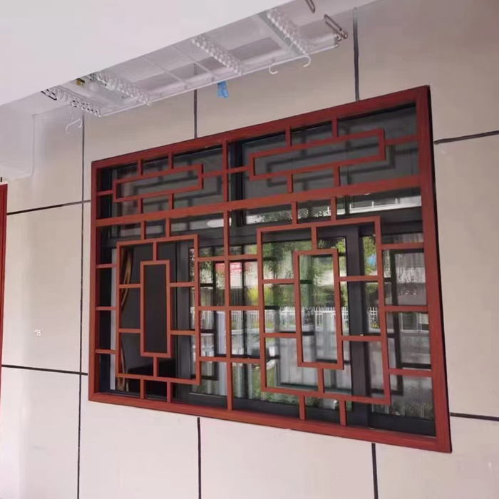 网格面板:由铝合金扁条通过数控机械开料、烧焊拼接、打磨等工艺制成,可设计成各种窗花图案。