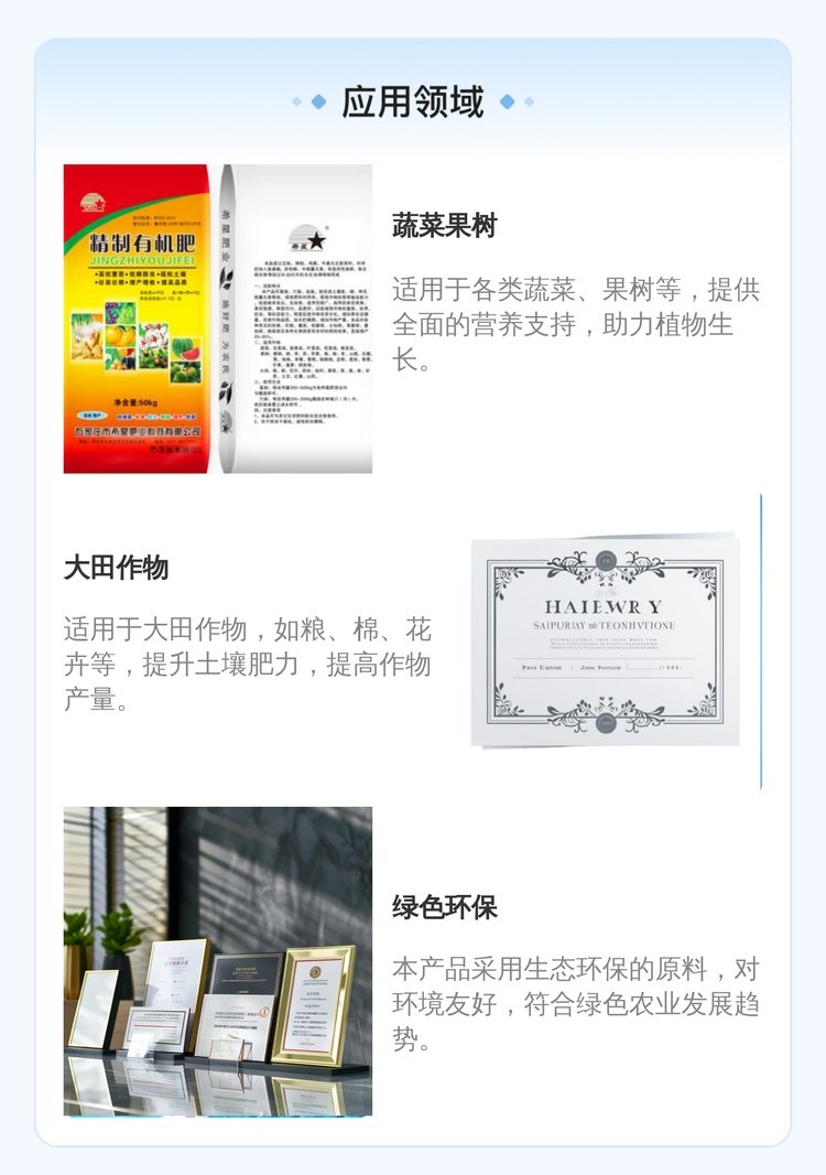 适用范围:蔬菜:适用于瓜果类、叶菜类、花菜类、根茎类等蔬菜作物;果树:樱桃、桃、李、杏、苹果、梨、核桃等果树作物;大田:粮、棉、花卉、药材、油料、烟草、茶、桑、麻、甘蔗、土豆、红薯、山药等