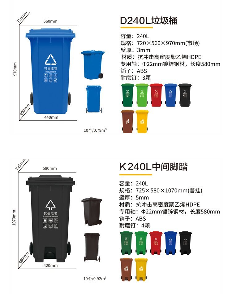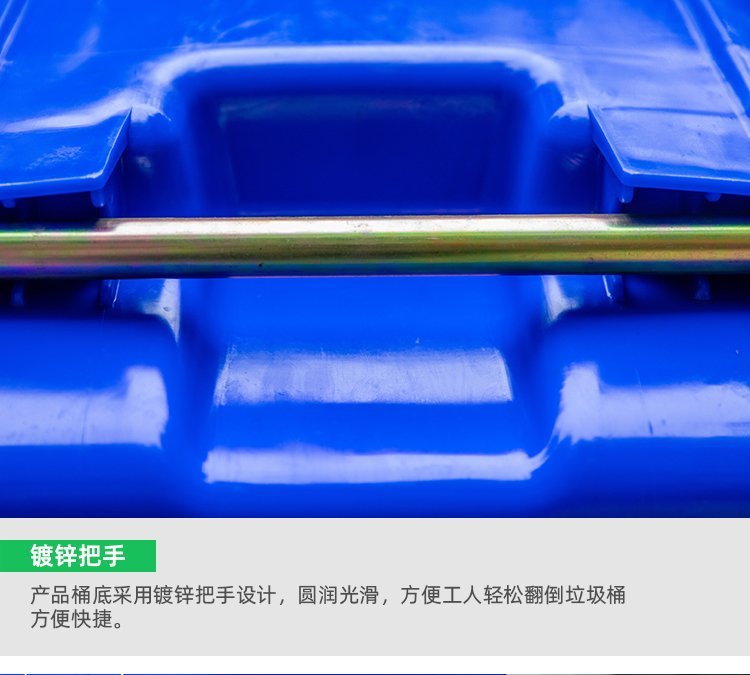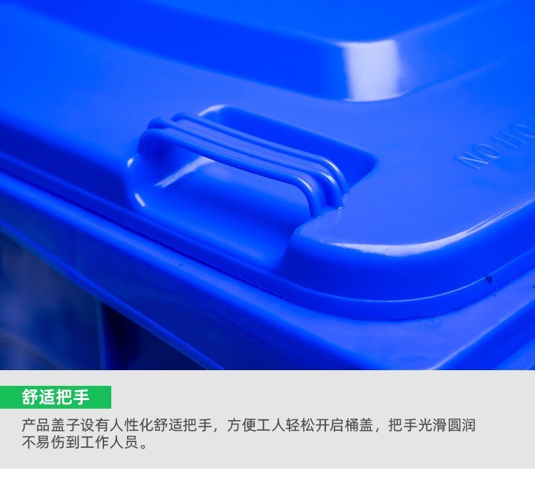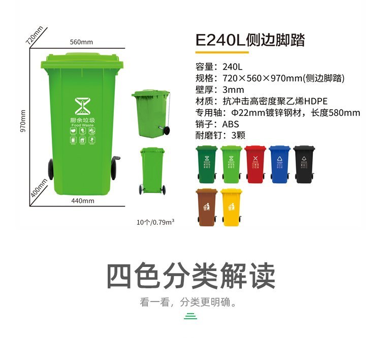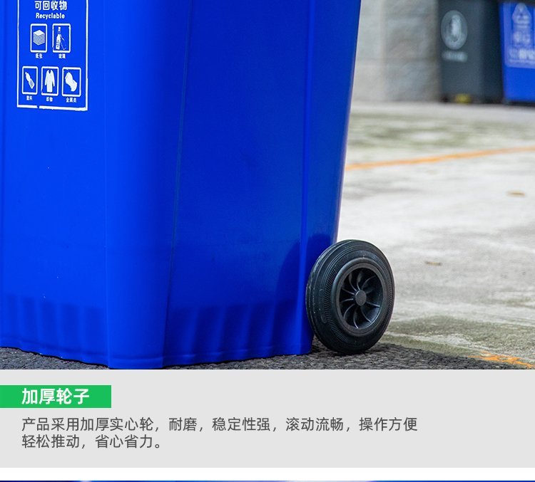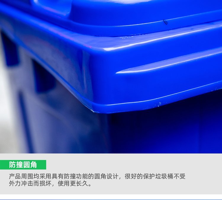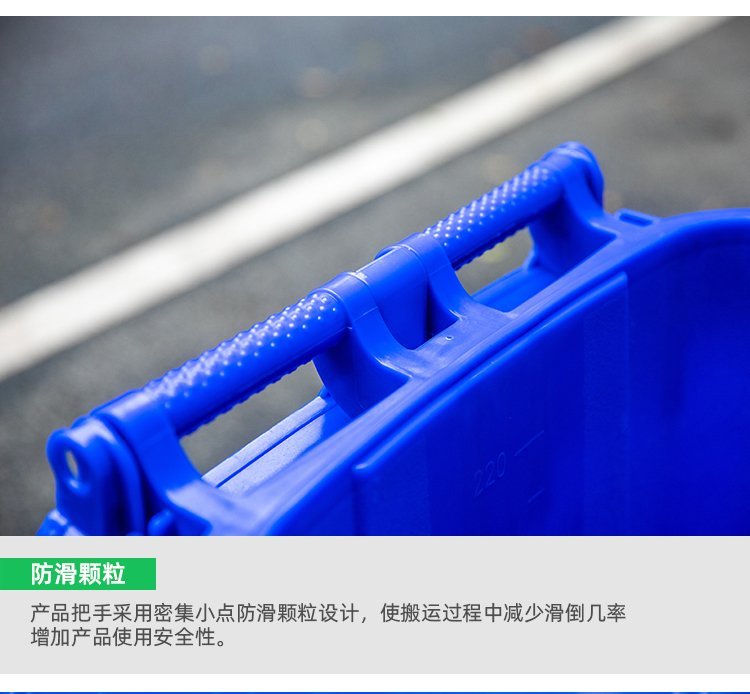 A240L塑料垃圾桶;本产品使用抗冲击高密度聚乙烯HDPE材料一次注塑而成,一体成型;