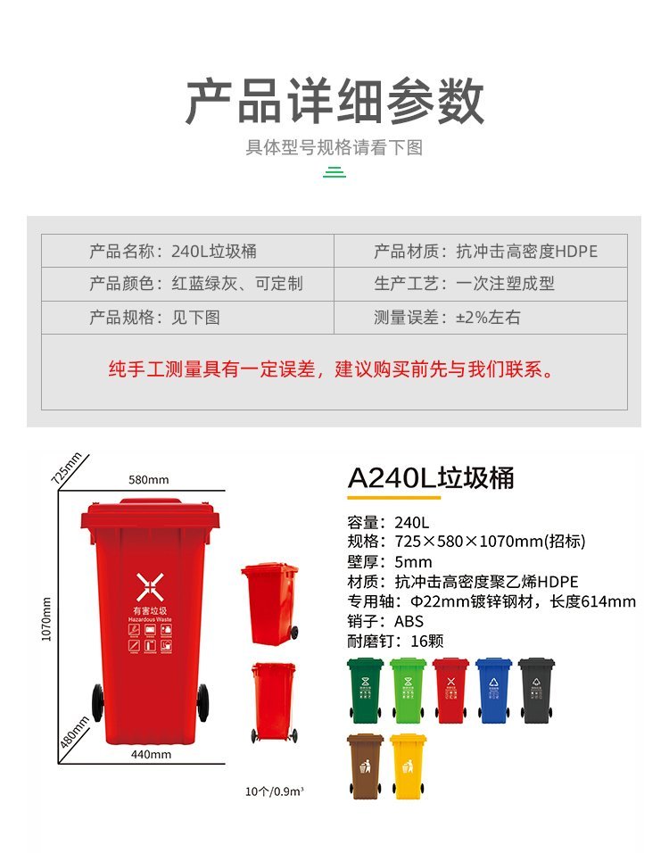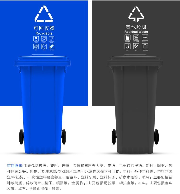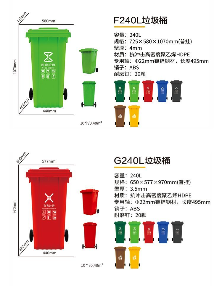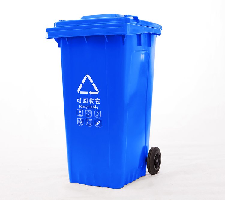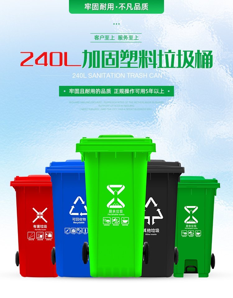 A240L塑料垃圾桶;本产品使用抗冲击高密度聚乙烯HDPE材料一次注塑而成,一体成型;