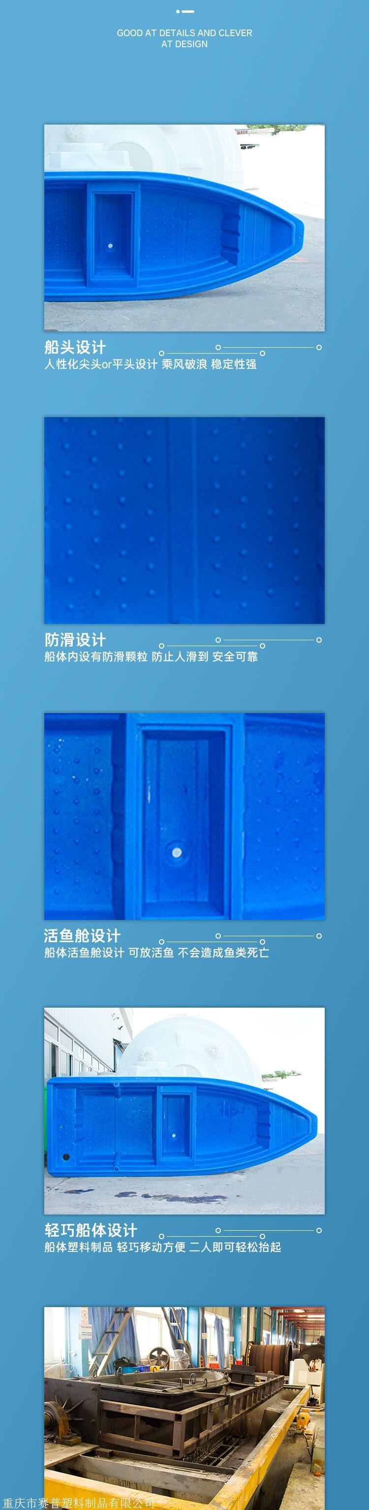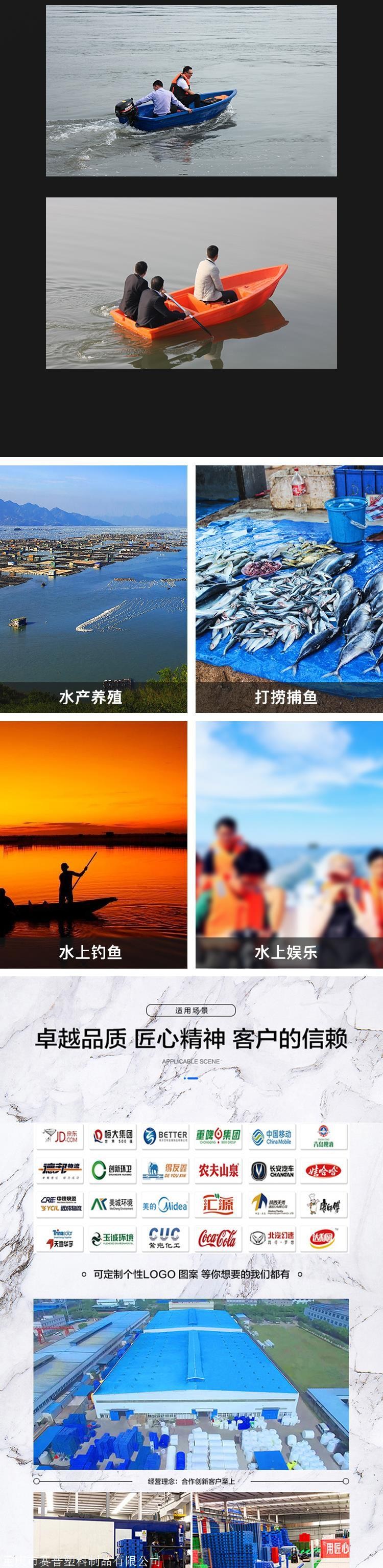 塑料渔船产品优势: 一,采用国内先进的滚塑技术,产品一次成型,船体为双层机构制造,更加牢固。 二,耐各种水质侵蚀,如海水污水,表面光滑,使用后清水一冲就干净,船体轻巧,不易碰伤人的身体,安全可靠,靠电动马达行使轻松省电。 三,塑料制品船体轻,移动方便,二人能轻松抬起。 四,可以安装电动马达,行使时无声音,不易惊动鱼类。 五,船体表面采用防滑设计,不过提醒广大亲们在船上行走时注意安全。
