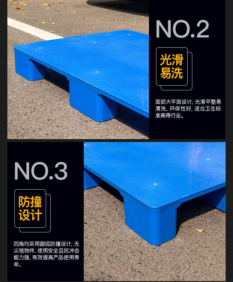 4. 托盘四面进叉,适合平地、堆垛、货架、叉车周转货物使用。