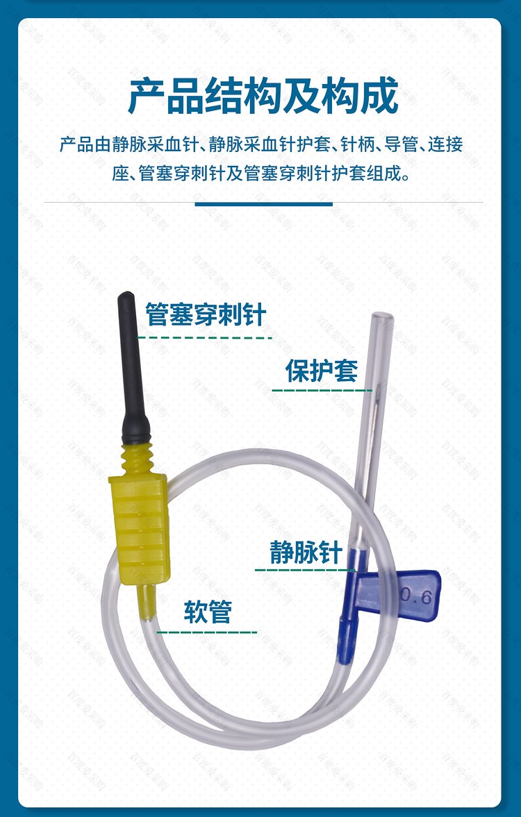 | 结构及组成 | 静脉采血针、静脉采血针护套、针柄、导管、连接座、管塞穿刺针、管塞穿刺针护套 | ||